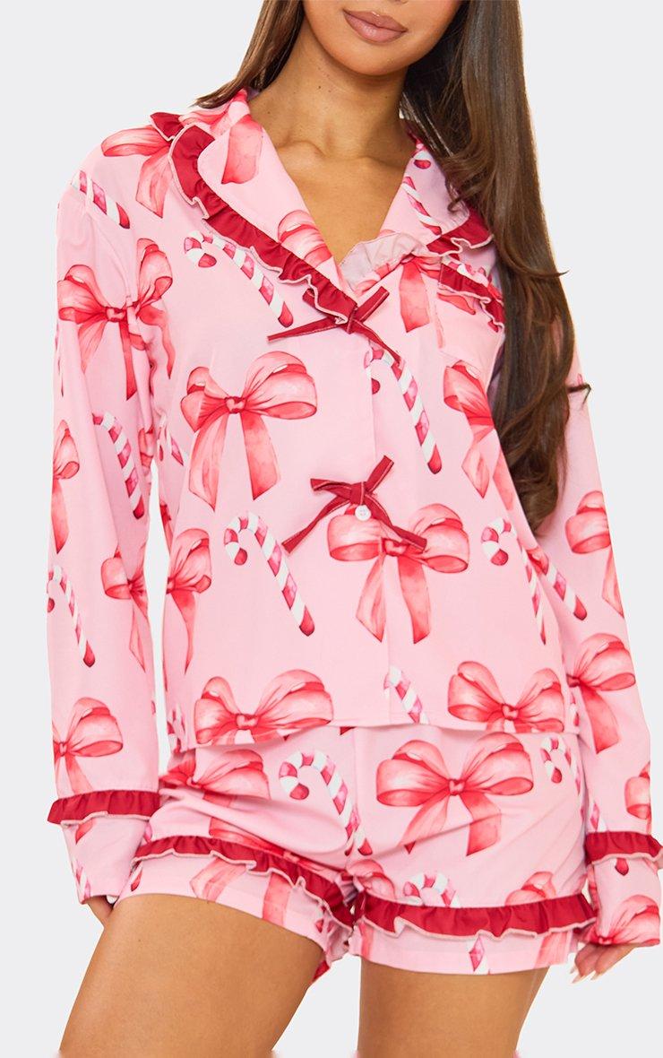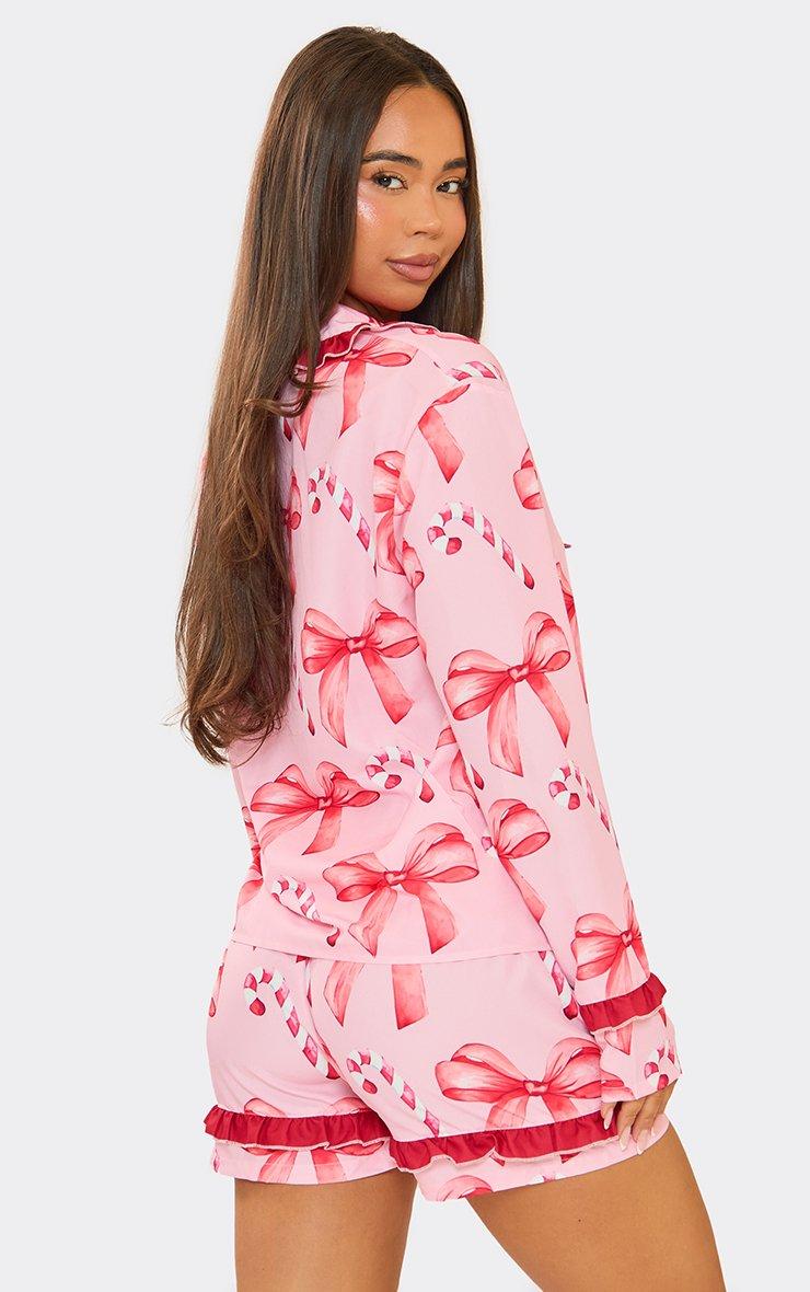 Long Sleeve Piping Detail Button Front Top And Trouser Pyjama Set In Pink Bow Print
