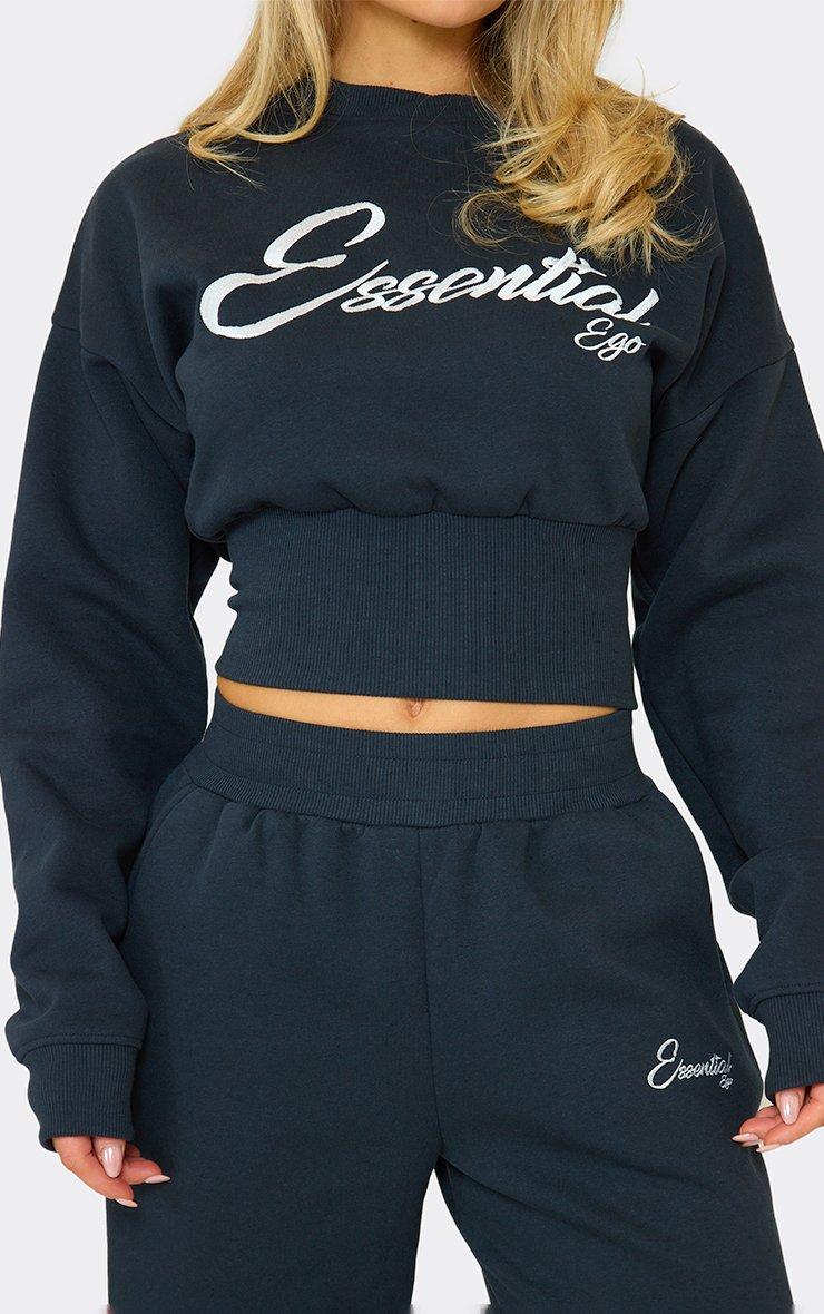 long sleeve graphic detail cinched waist cropped sweatshirt in navy blue