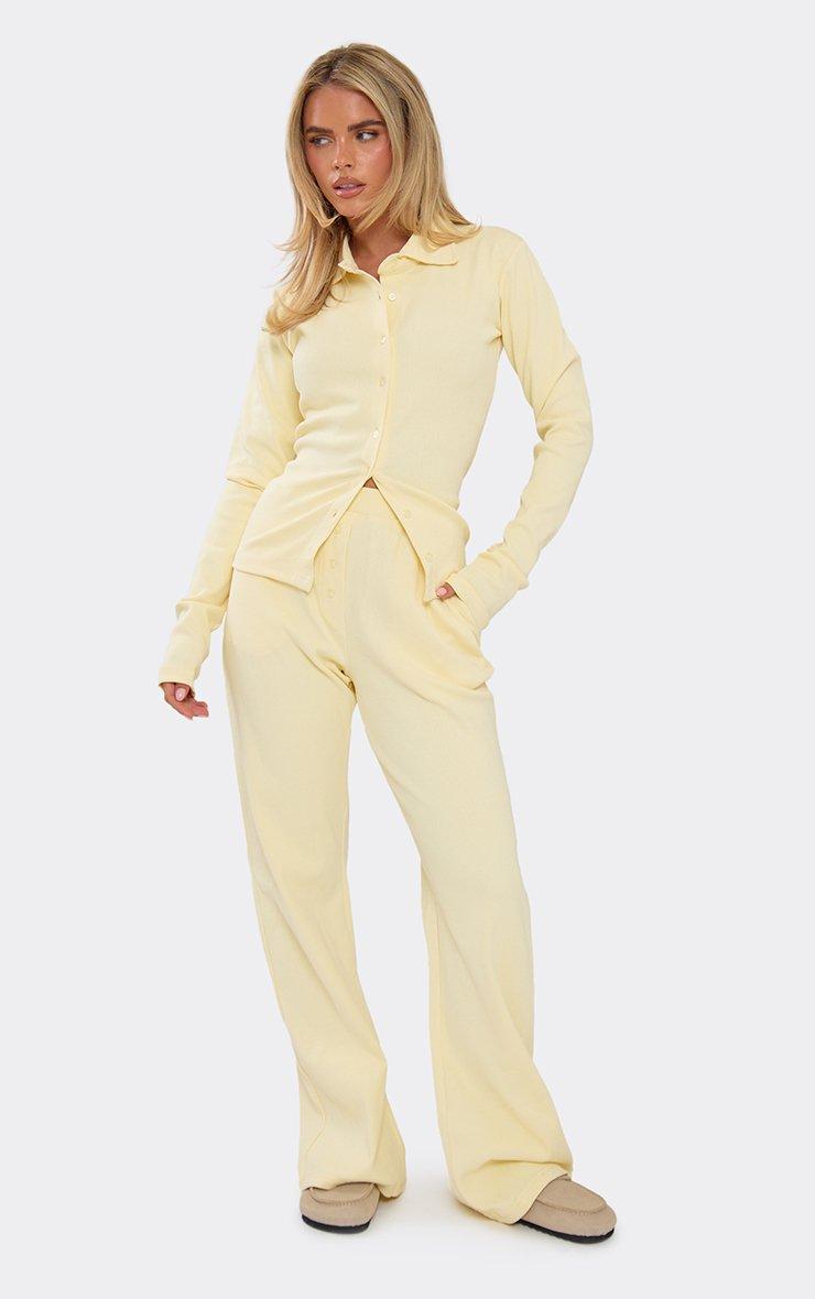 Long Sleeve Collared Button Up Fitted Top In Yellow Ribbed