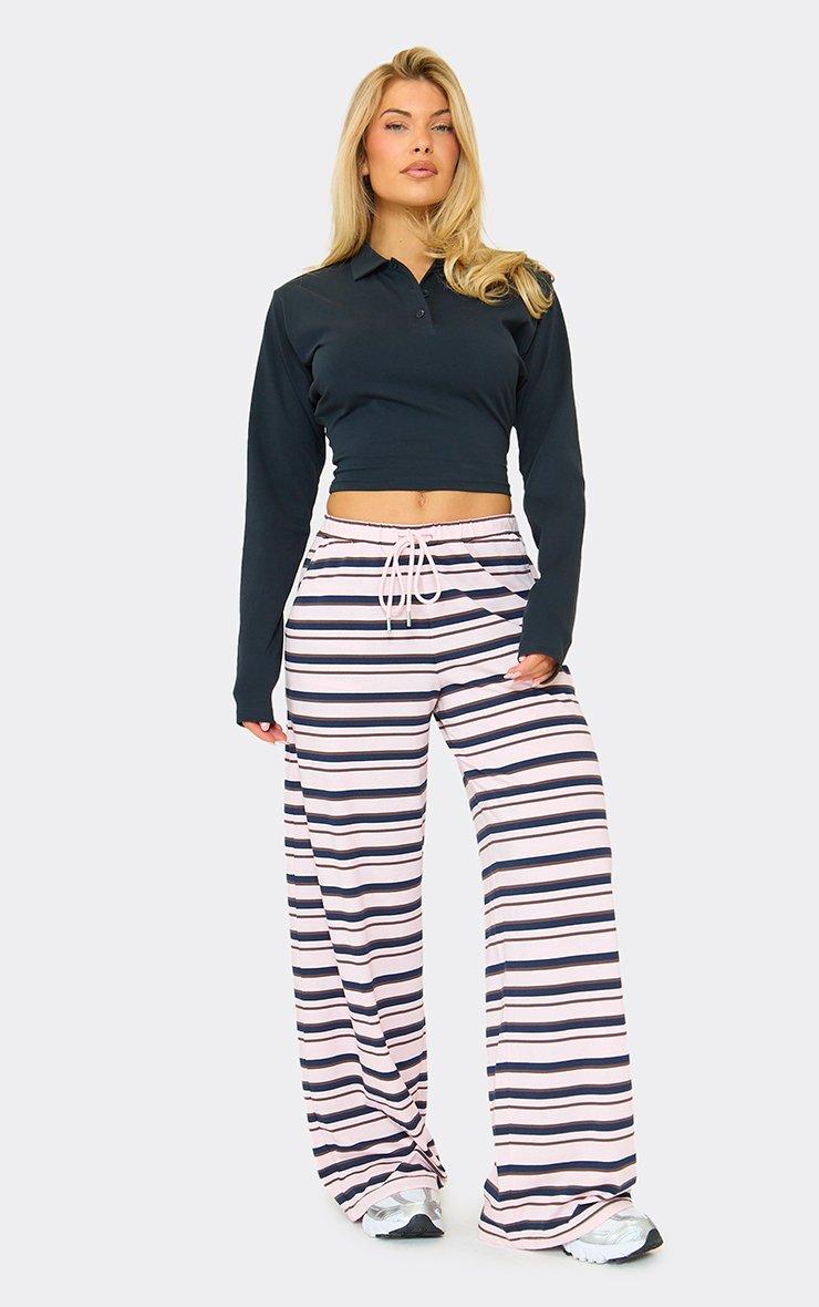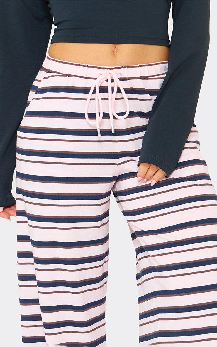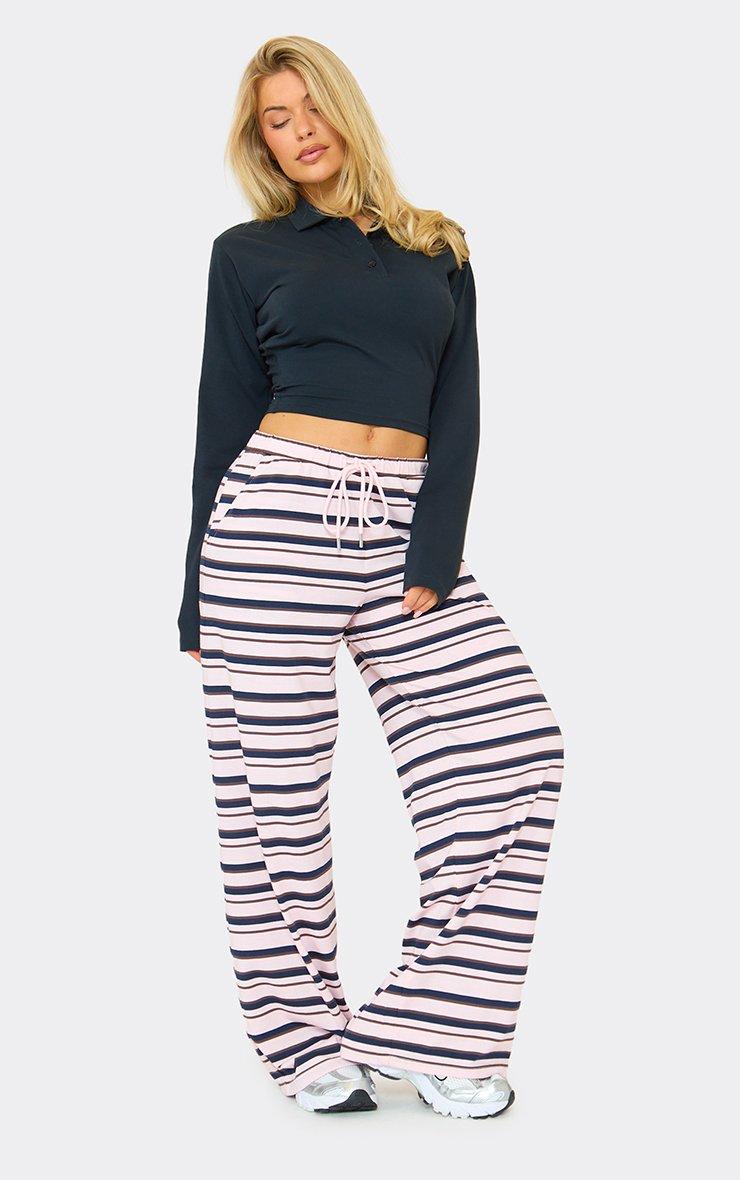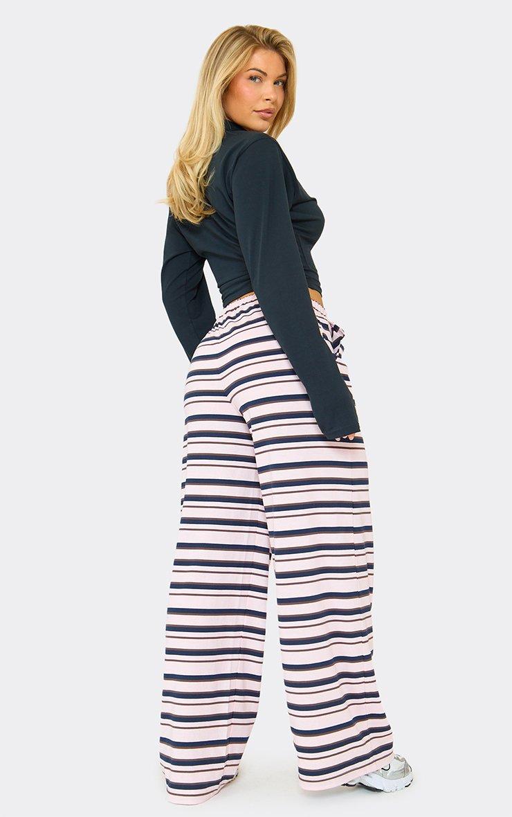 Mid Rise Elasticated Waist Wide Leg Trousers In Pink Linen