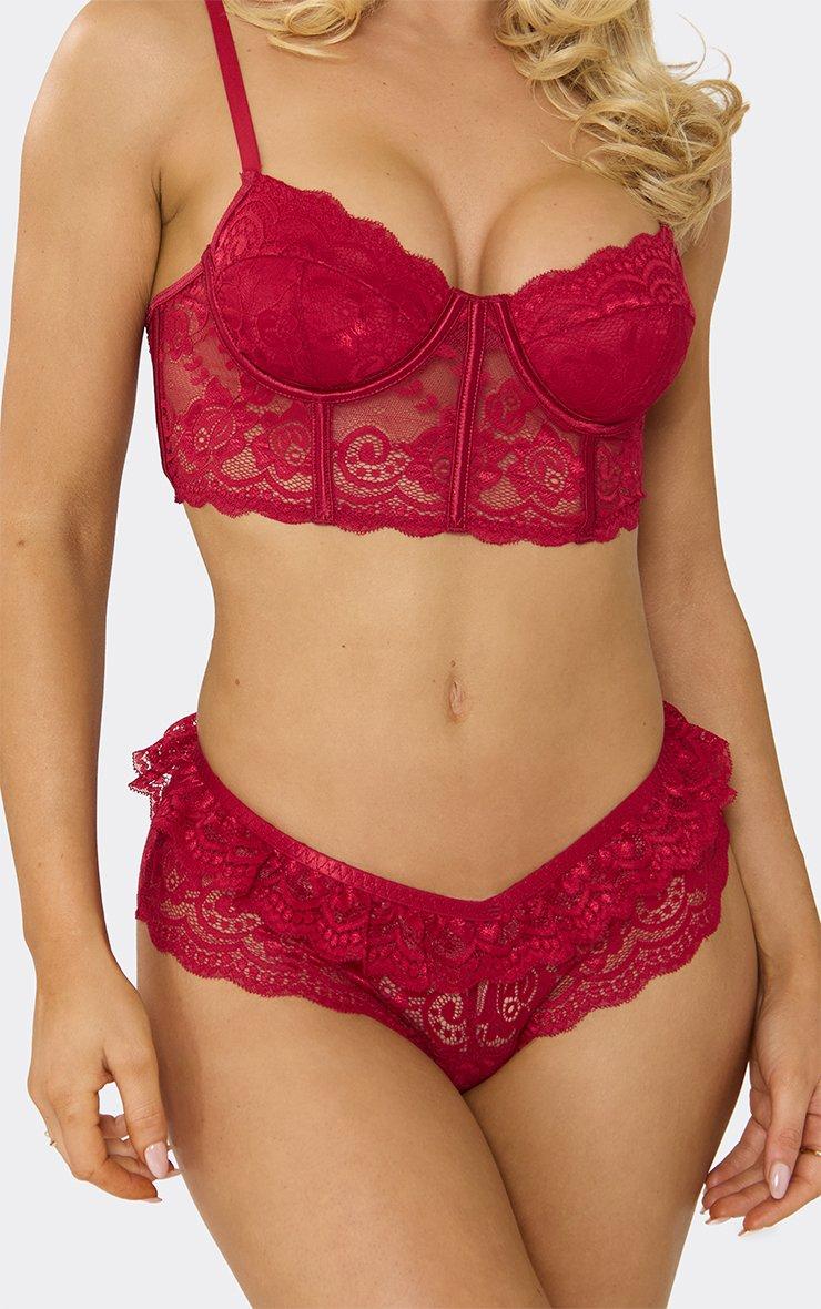 underwired longline bra and frilled brazilian knicker lingerie set in burgundy lace