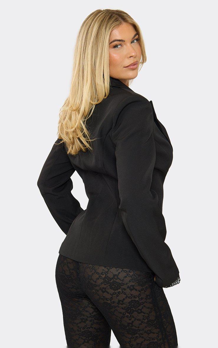 Long Sleeve Lace Trim Cinched Waist Blazer In Black Woven