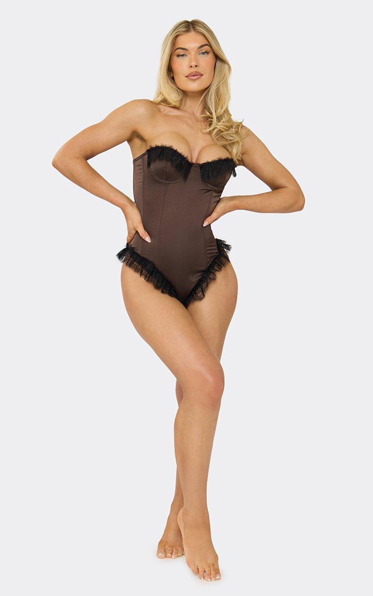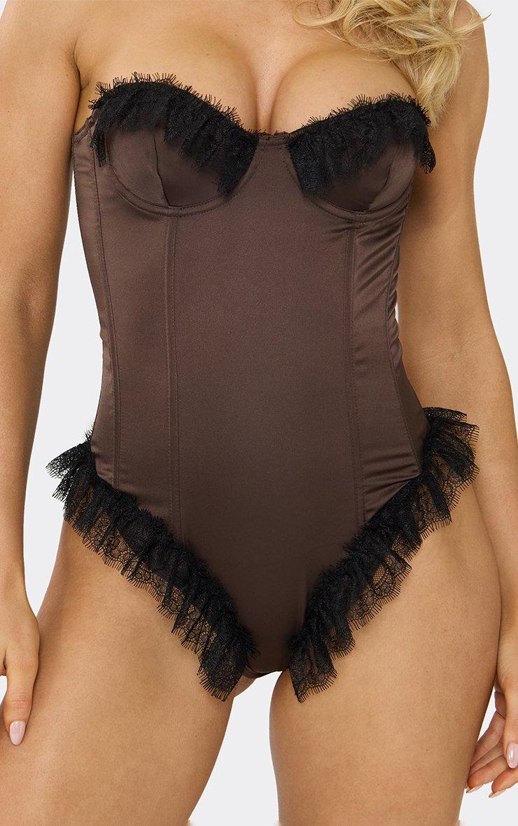 Underwired Contrast Lace Trim Bodysuit In Chocolate Satin