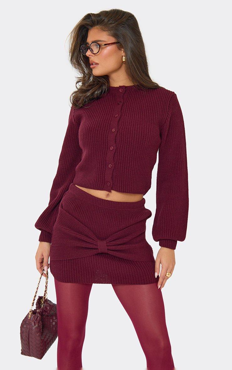 Balloon Sleeve Button Down Cardigan In Burgundy Knit