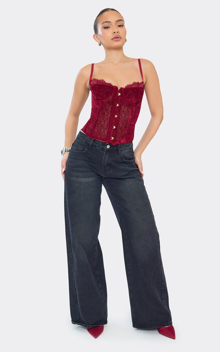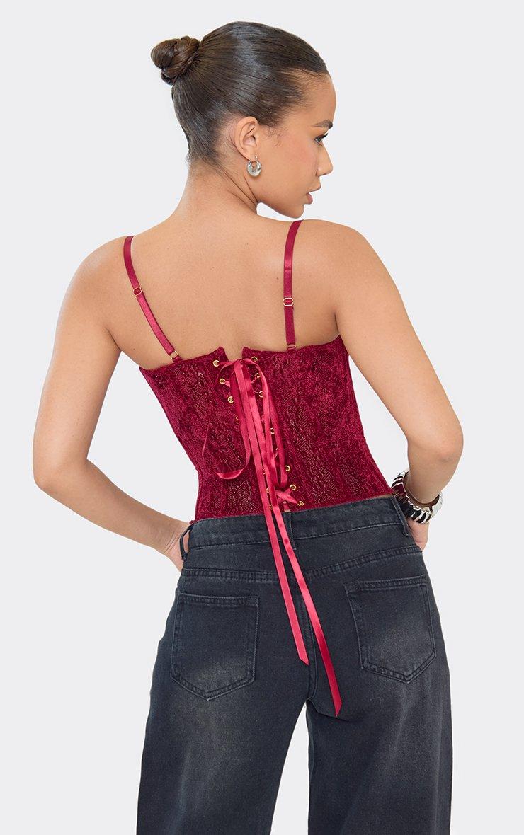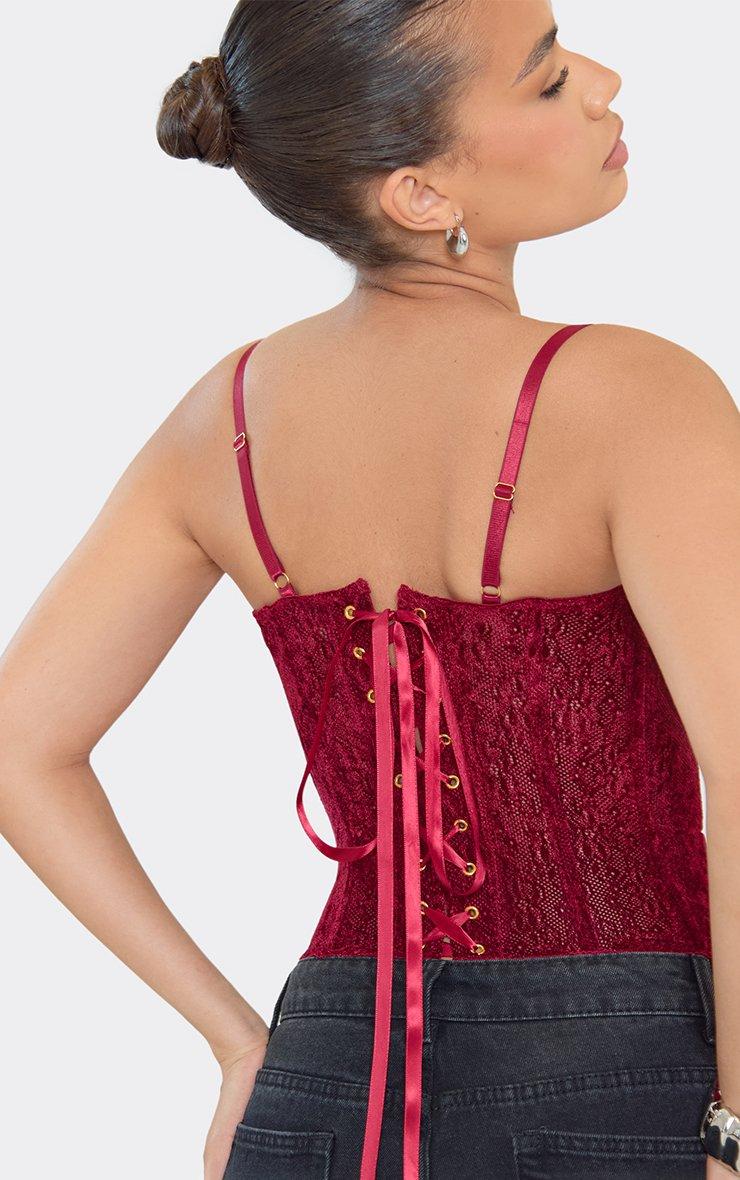 Strappy Hook And Eye Corset Top In Burgundy Velvet Lace