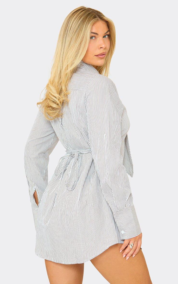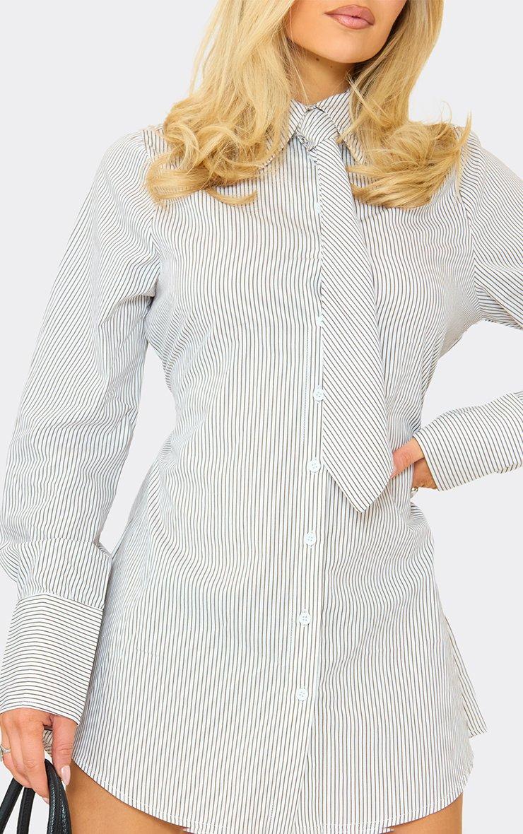 Long Sleeve Tie Detail Shirt Dress In Black Pinstripe