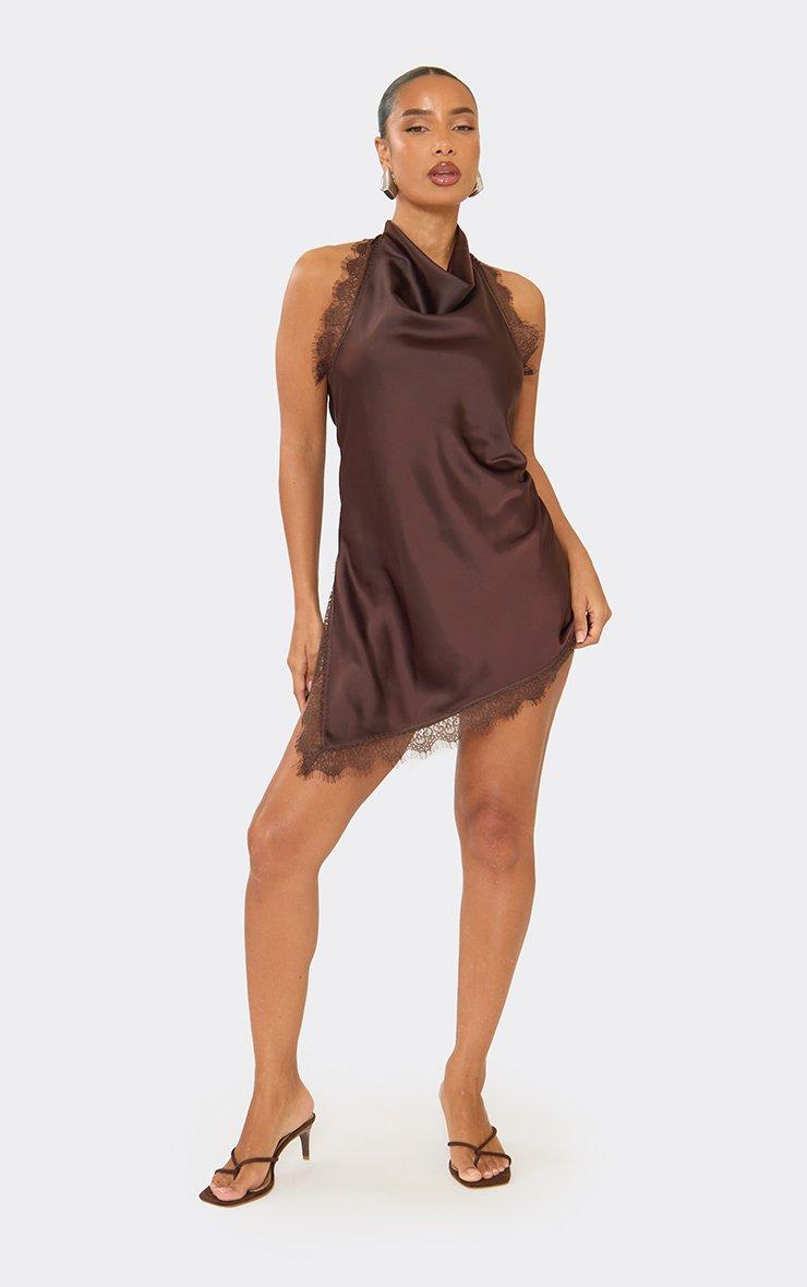 Cowl Neck Lace Trim Asymmetric Hem Mini Dress In Chocolate Brown