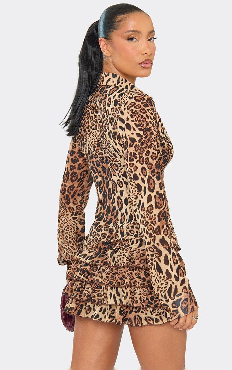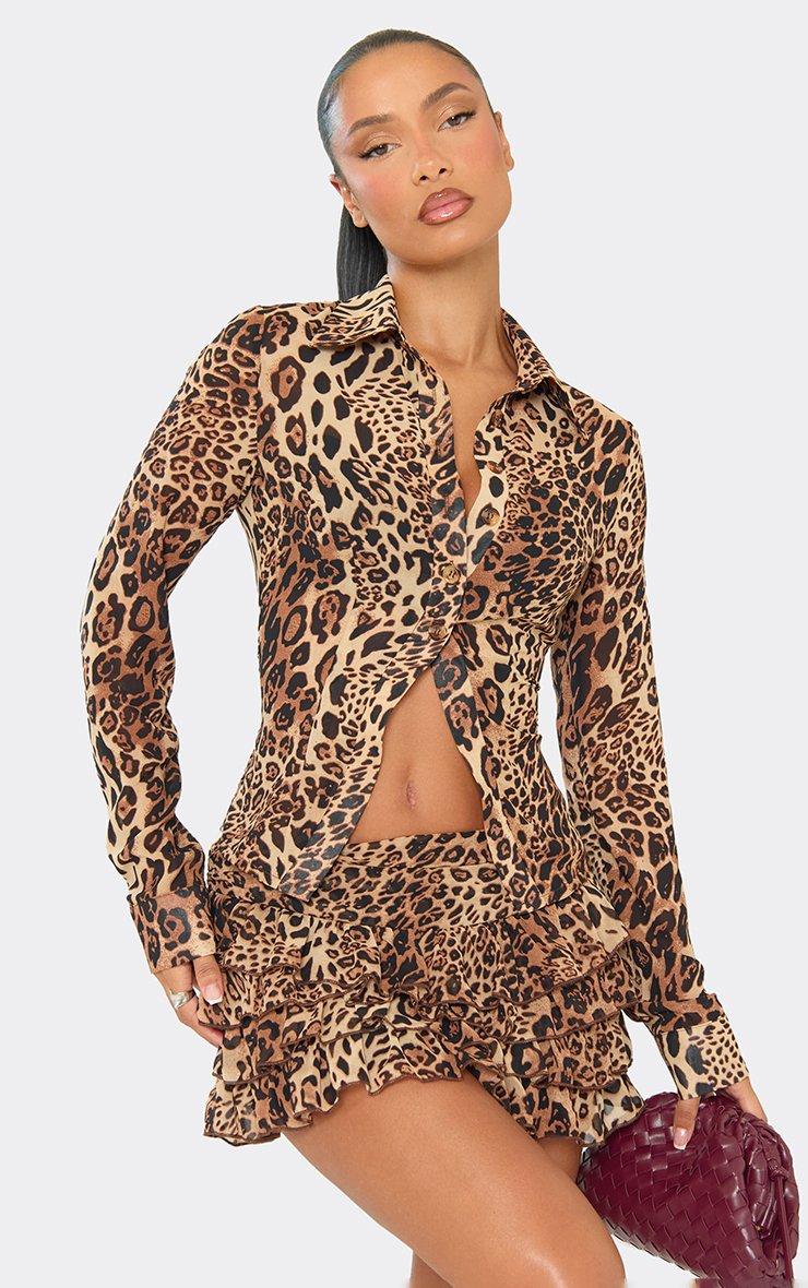 Long Sleeve Cinched Shirt In Brown Leopard Print