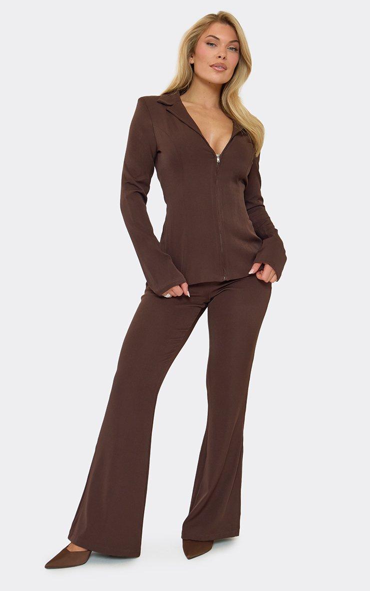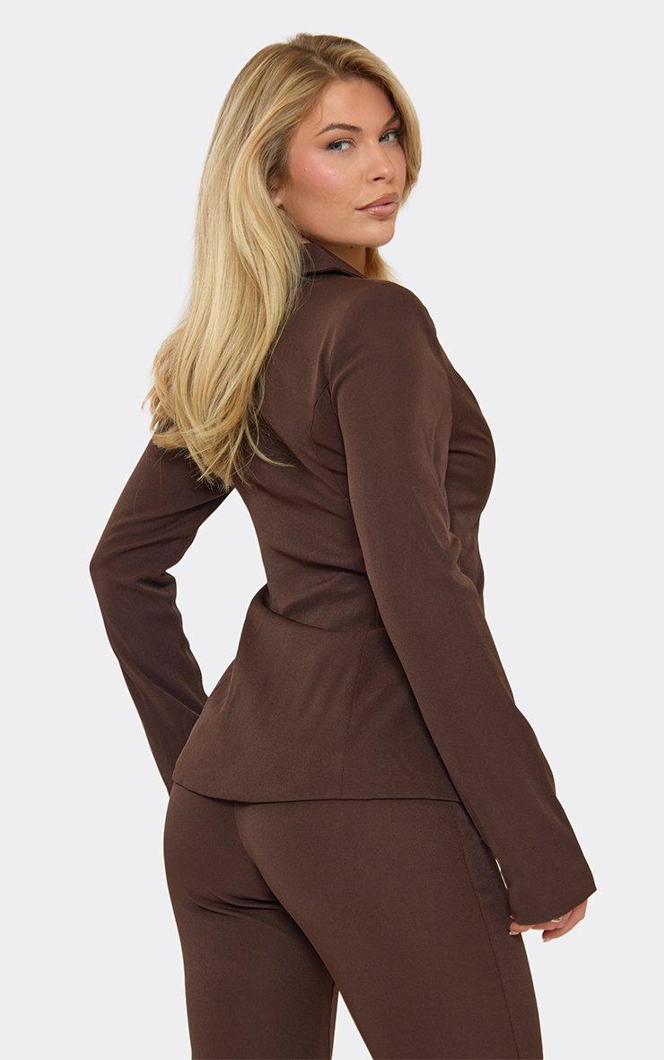 Long Sleeve Zip Front Cinched Fitted Blazer In Chocolate Brown