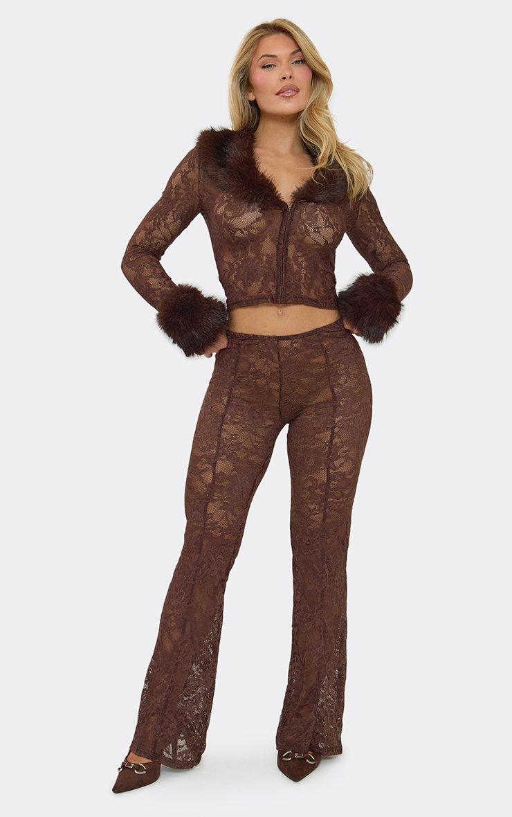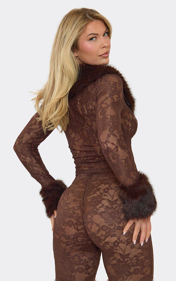 Long Sleeve Fur Trim Top In Chocolate Brown Lace