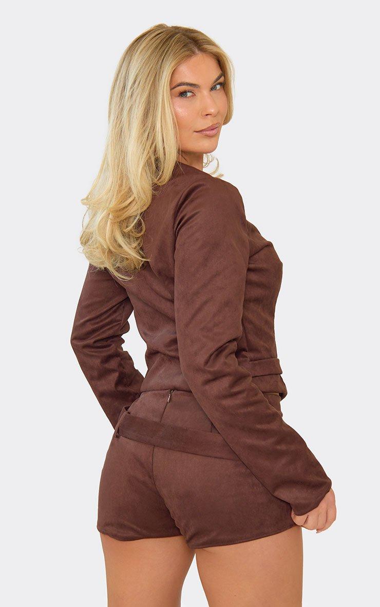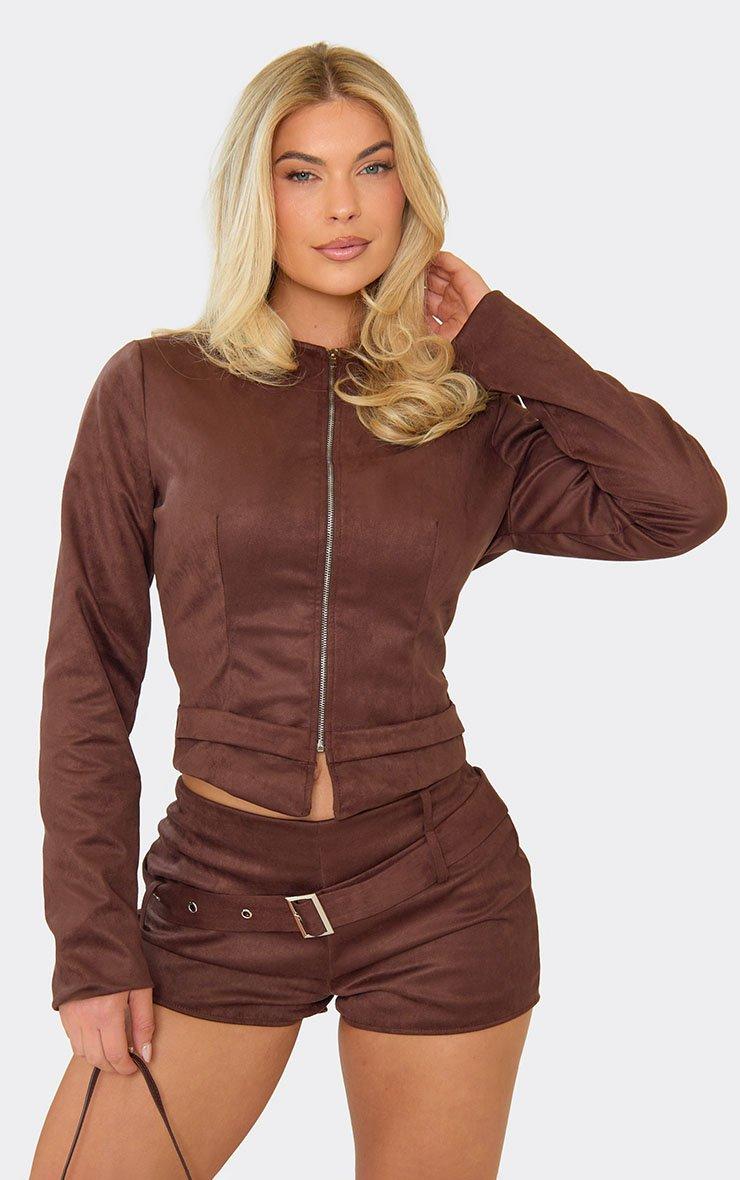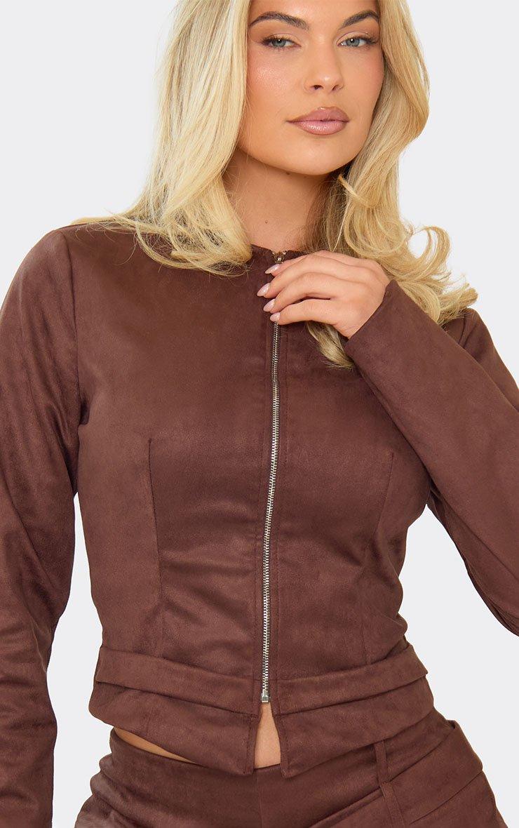 Long Sleeve Zip Front Top In Chocolate Brown Faux Suede