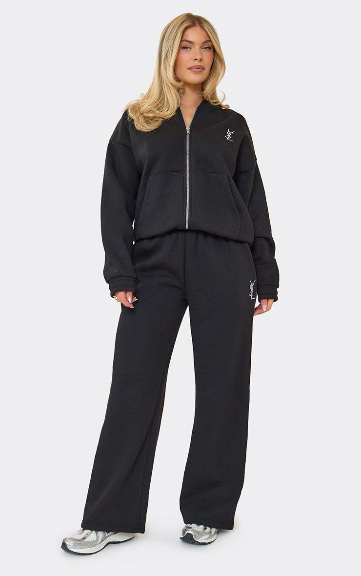 Mid Rise Embroidered Graphic Wide Leg Joggers In Black
