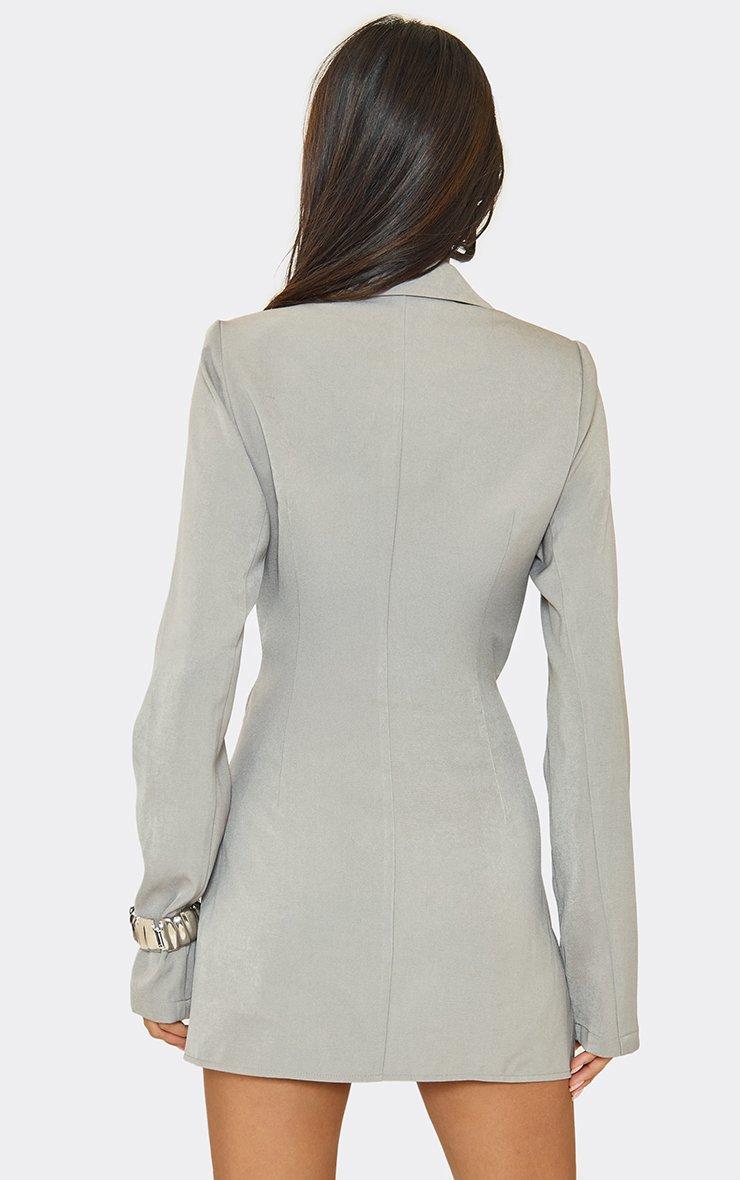 Long Sleeve Wrap Waist Blazer Dress In Grey Woven