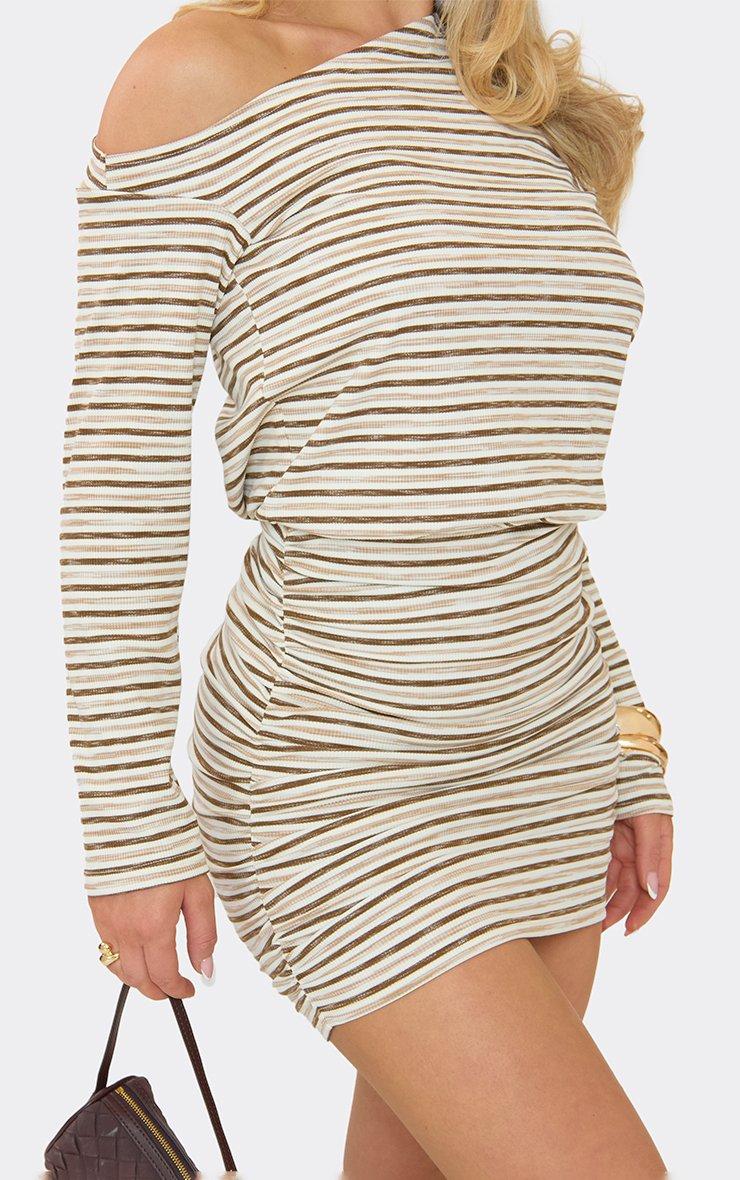 Long Sleeve Asymmetric Neck Slouchy Detail Mini Dress In Cream Stripe