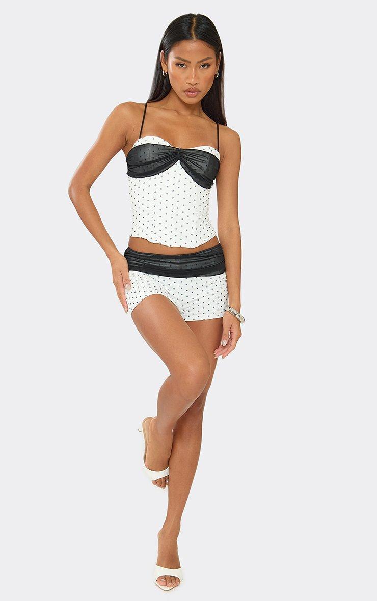 Mesh Foldover Detail Hotpant Booty Shorts In Cream Polka Dot Print