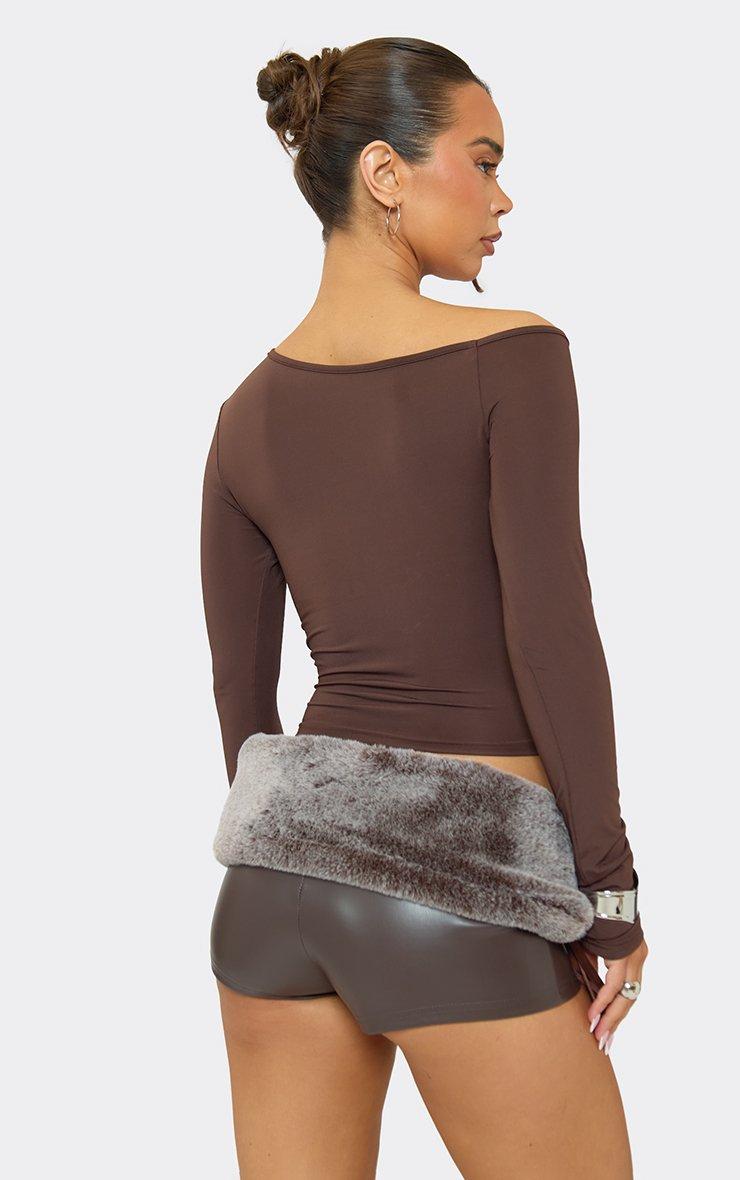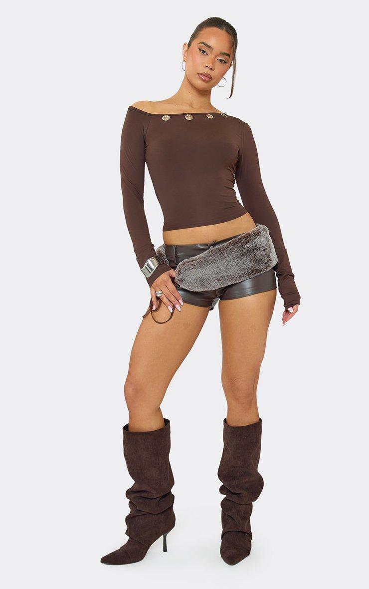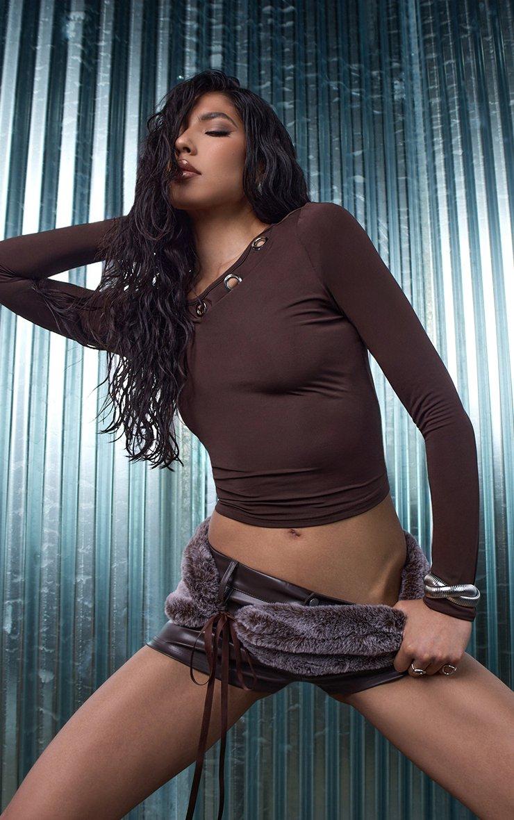 Long Sleeve Asymmetric Eyelet Detail Top In Chocolate Brown