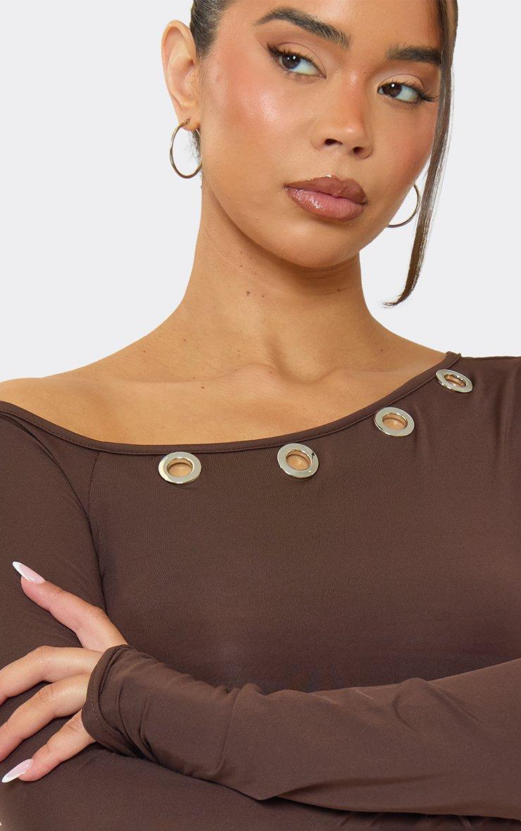 long sleeve asymmetric eyelet detail top in chocolate brown