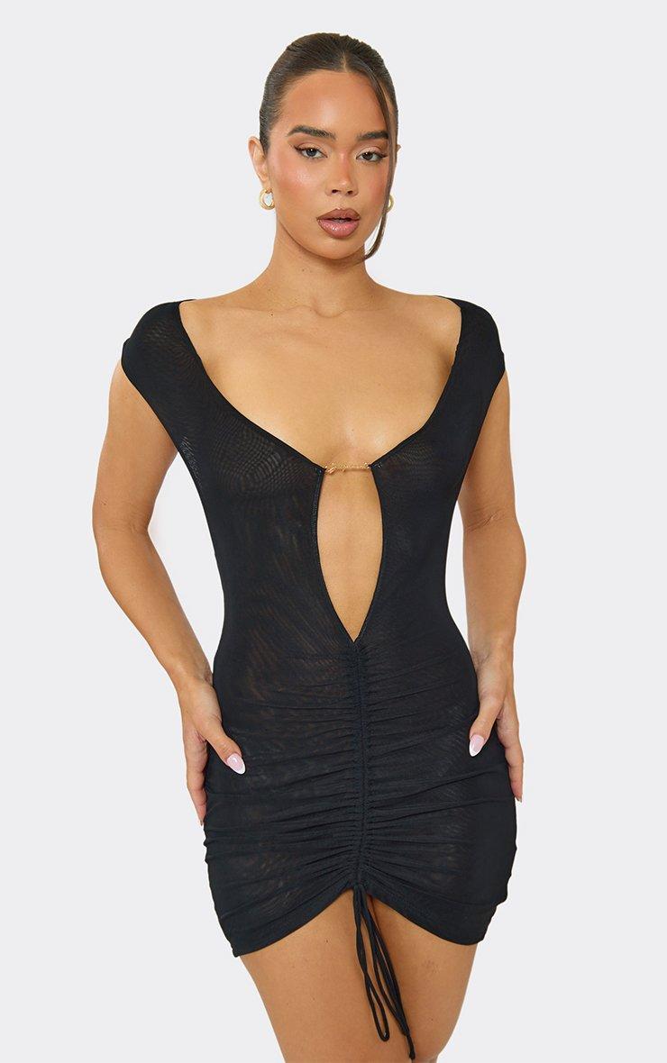 Capped Sleeve Cut Out Heart Detail Ruched Mini Dress In Black