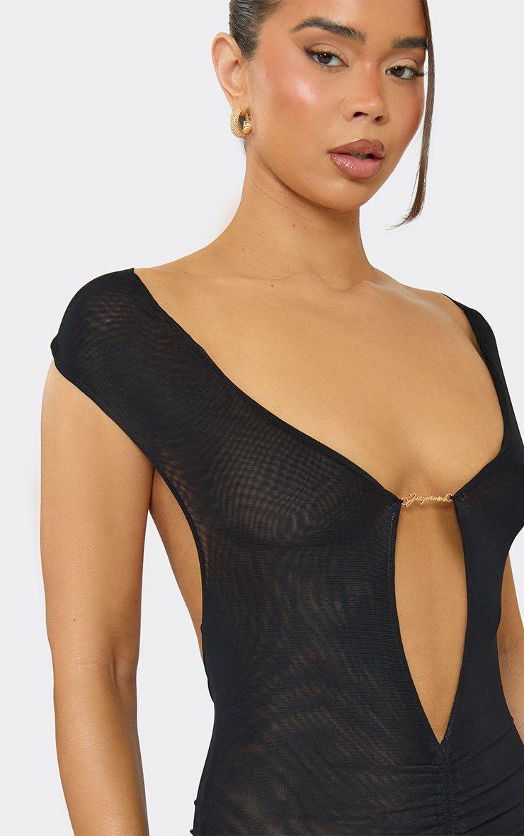 off the shoulder cut out ruched gold trim detail mini dress in black