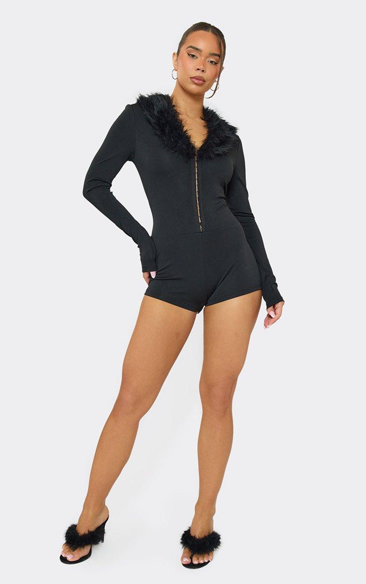 Long Sleeve Hook And Eye Fur Collar Detail Playsuit In Black