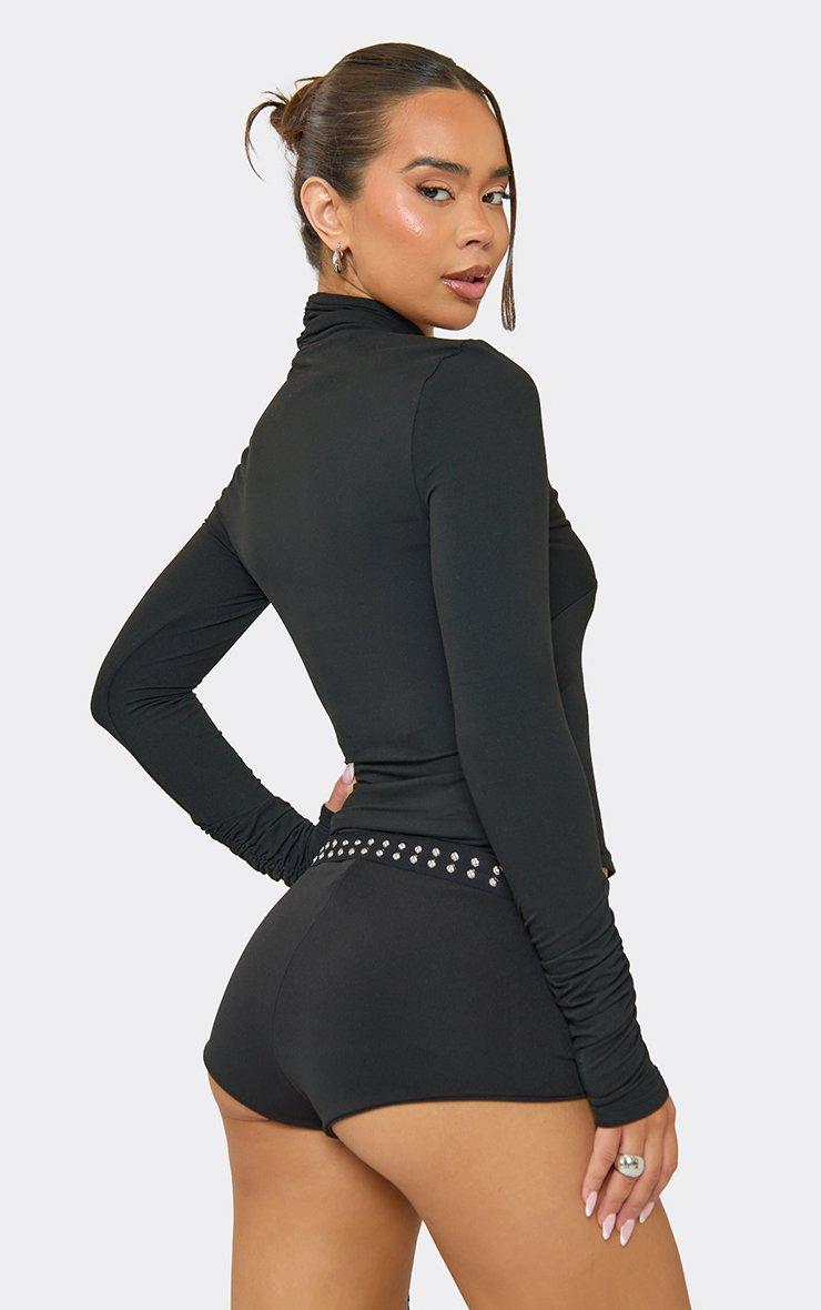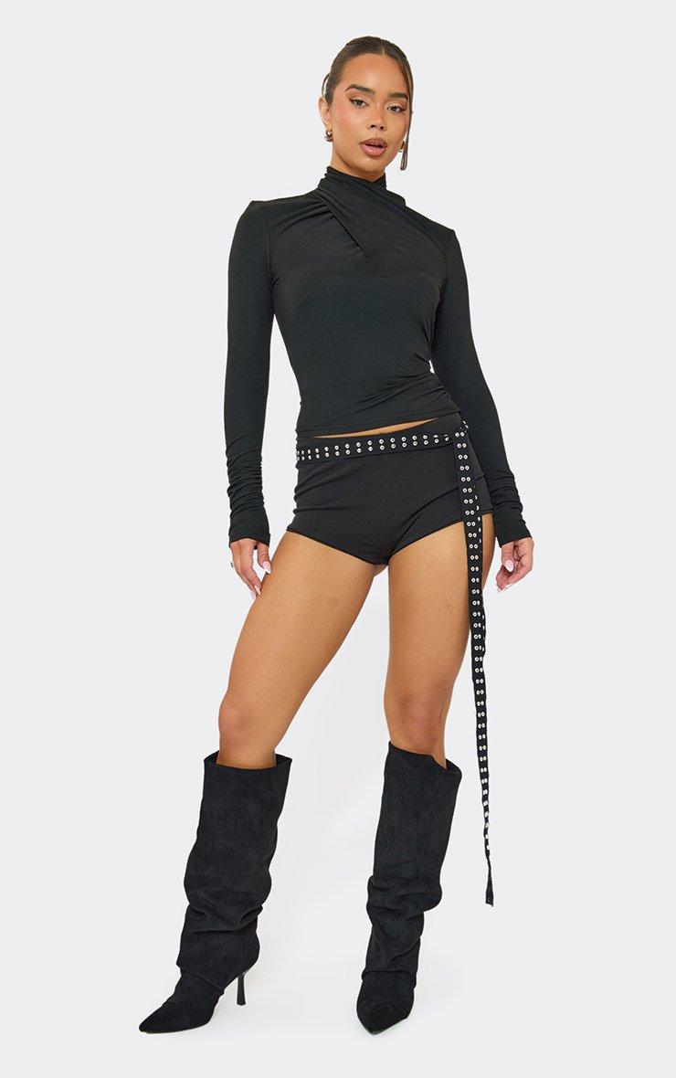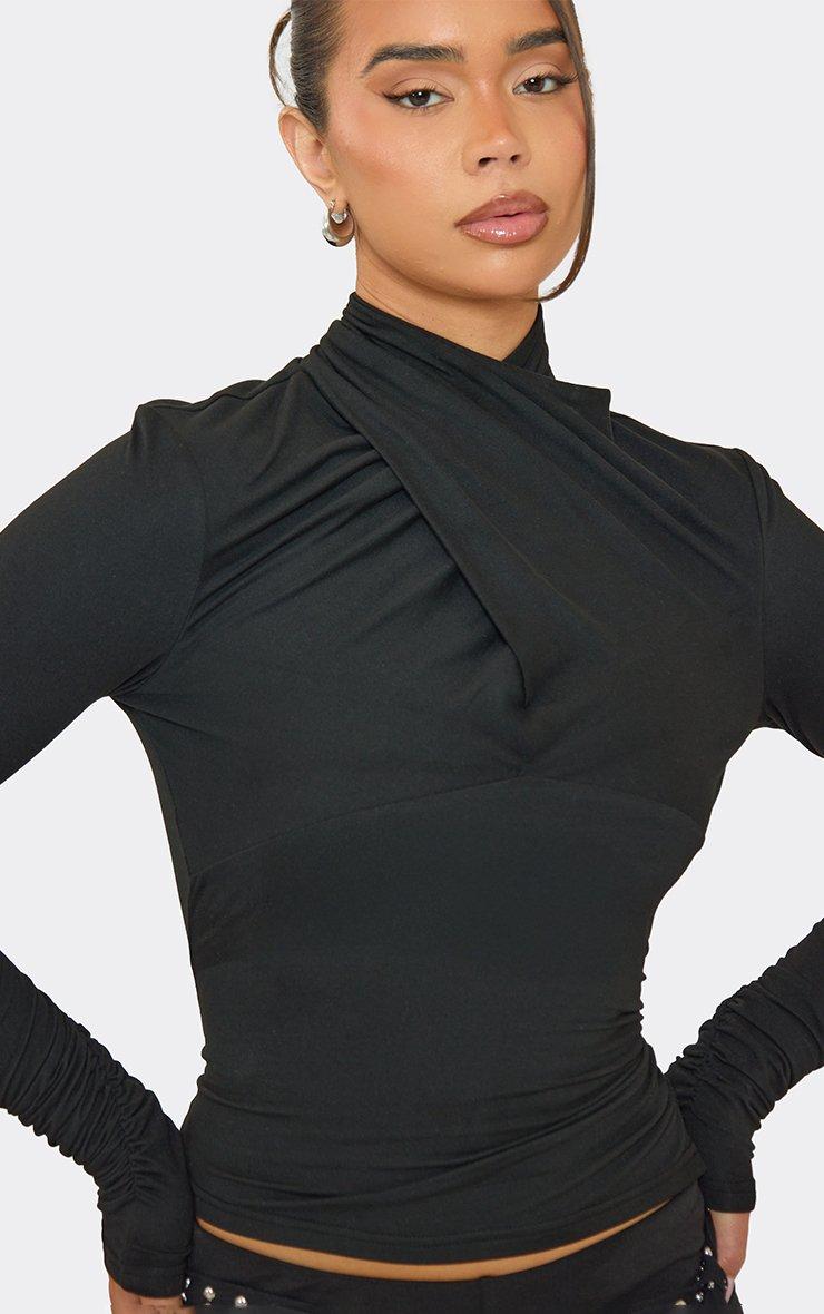 Long Sleeve Cowl Back Detail Top In Black Slinky