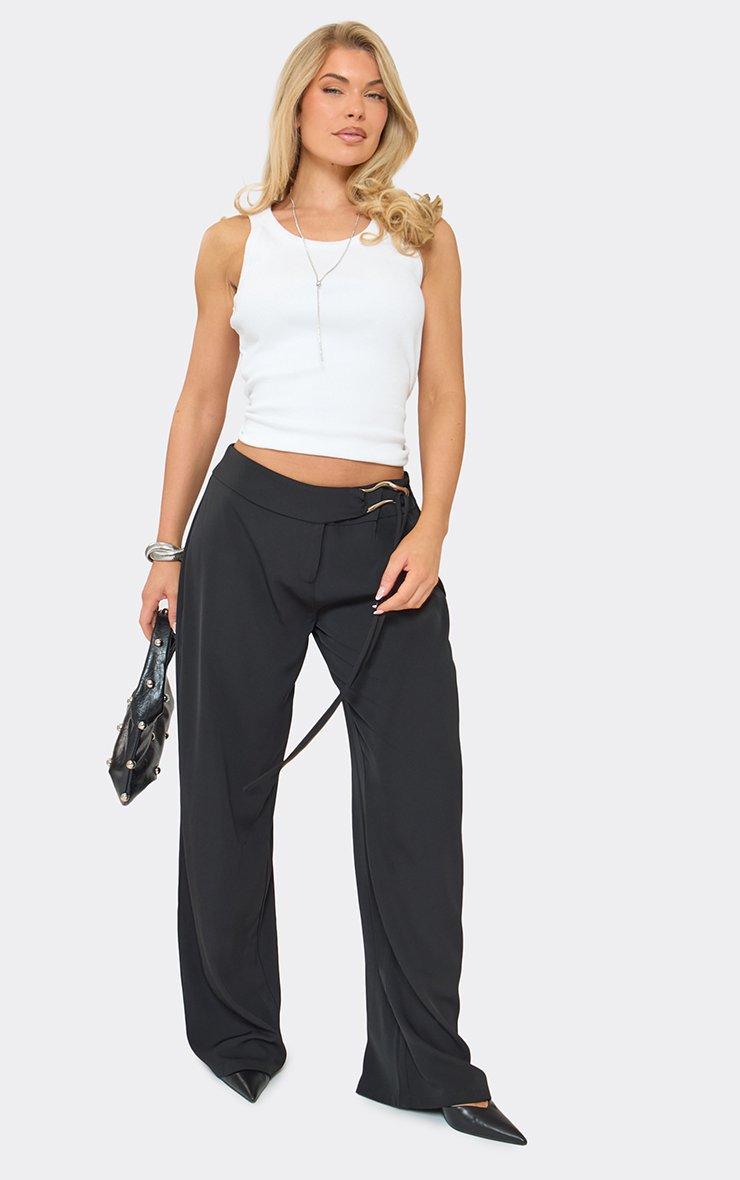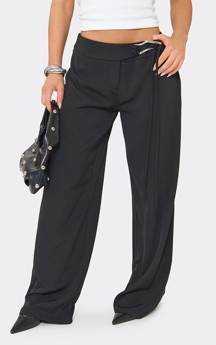Mid Rise Waistband Detail Wide Leg Trousers In Black