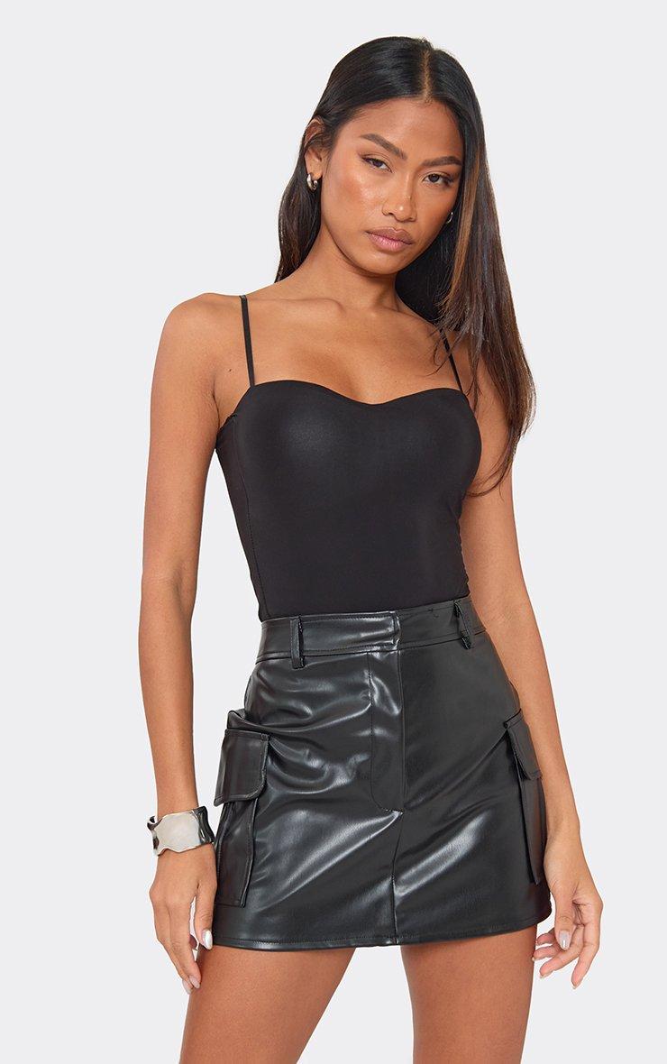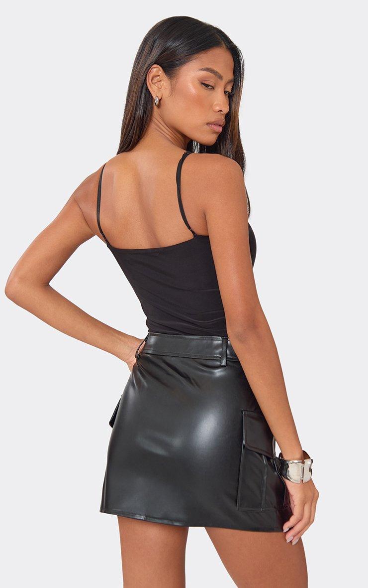 mid rise pocket detail faux leather mini skirt in black