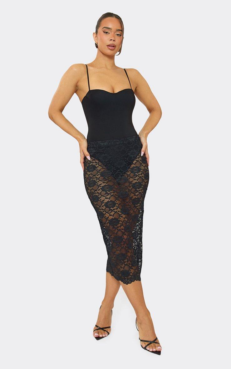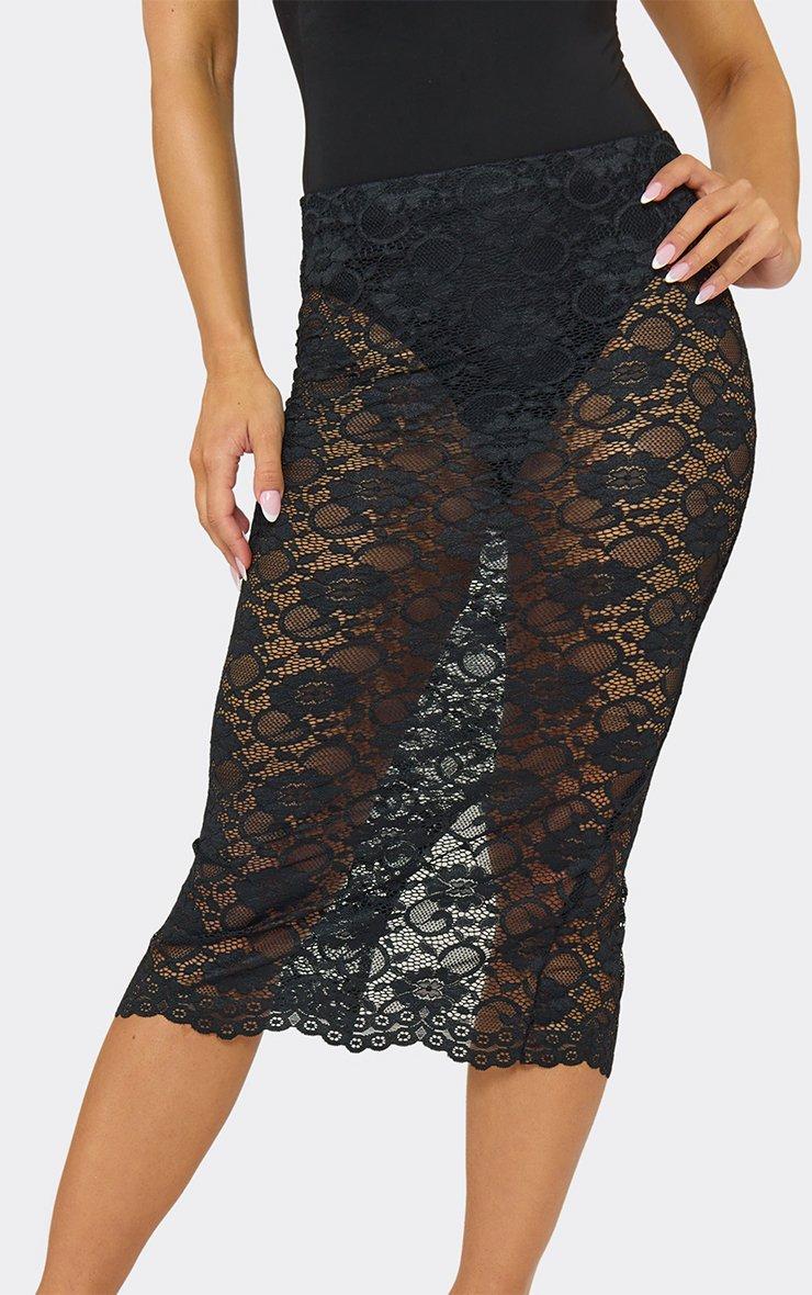 Mid Rise Knicker Insert Sheer Midi Skirt In Black Lace