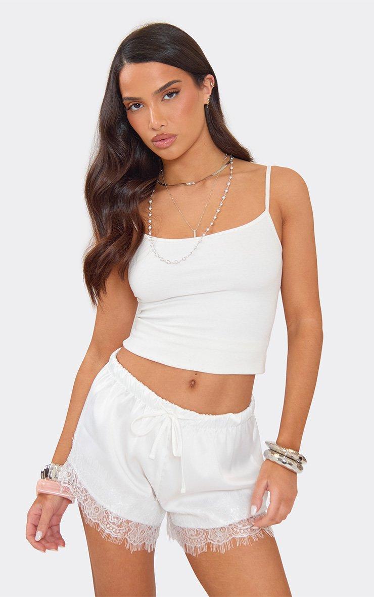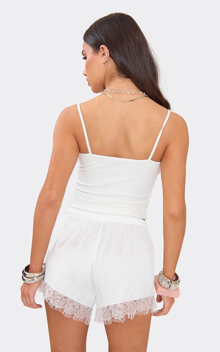 mid rise lace trim shorts in white satin
