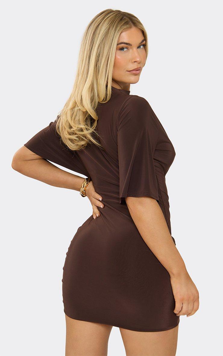 High Neck Asymmetric Sleeve Cut Out Ruched Mini Dress In Brown Slinky