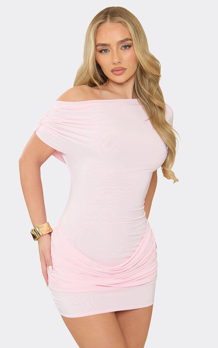 off the shoulder cowl back draped detail mini dress in baby pink