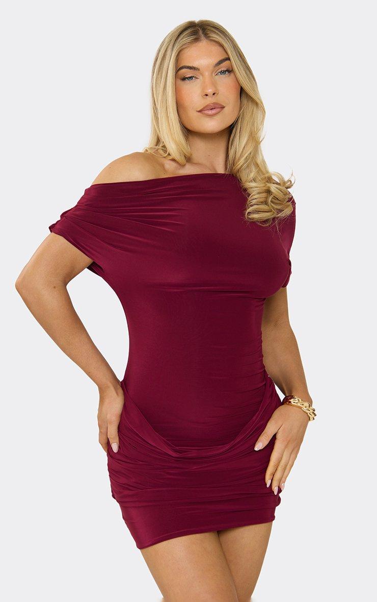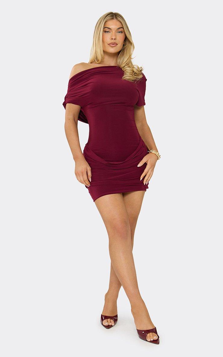 Off The Shoulder Cowl Back Draped Detail Mini Dress In Burgundy