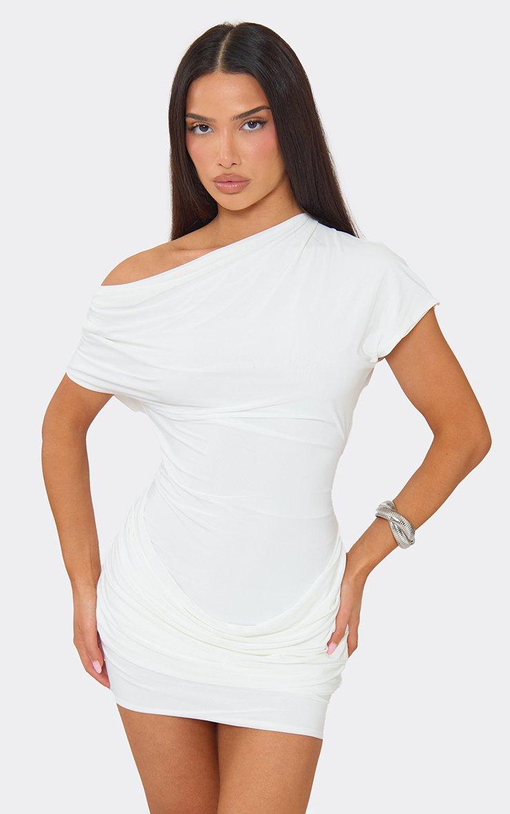 Off The Shoulder Cowl Back Draped Detail Mini Dress In Cream
