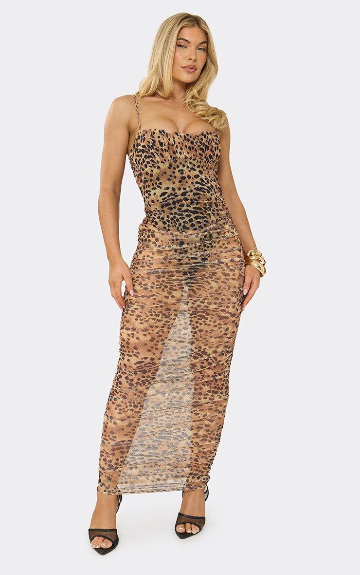 Bodysuit Lining Ruched Maxi Dress In Cheetah Print Mesh