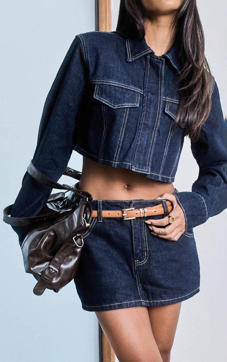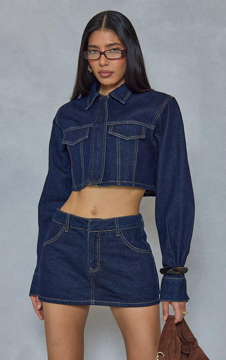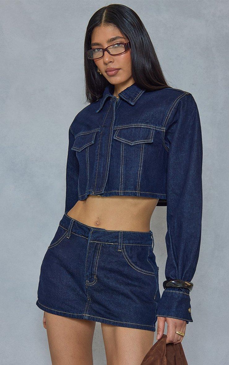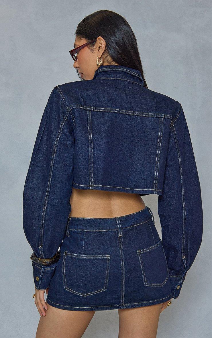 Long Sleeve Pocket Front Cropped Jacket In Indigo Denim