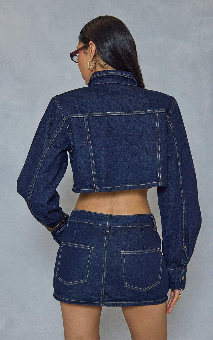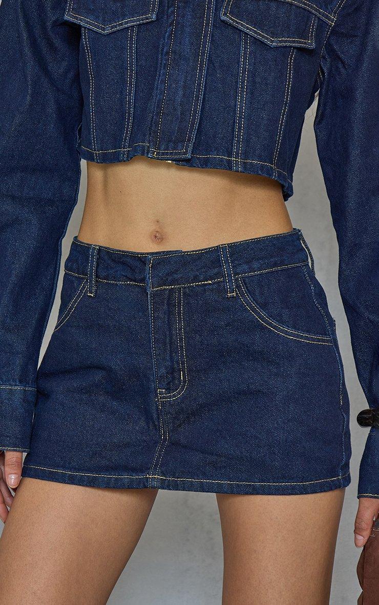 mid rise contrast stitch mini skort in indigo denim