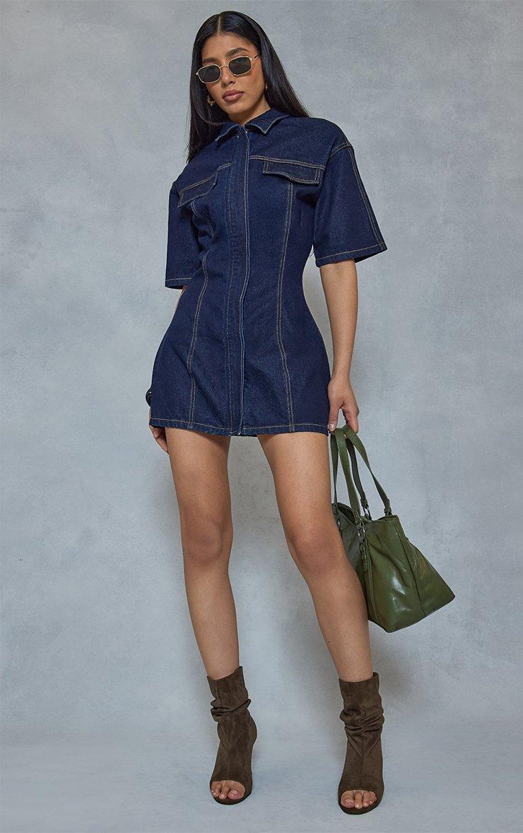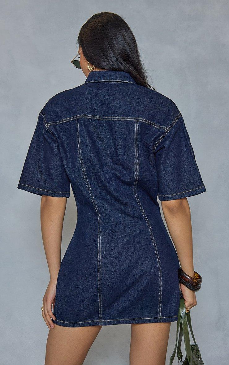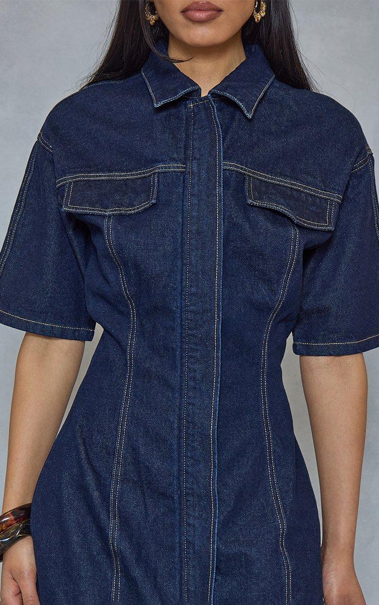 short sleeve cinched waist seam detail mini dress in indigo denim