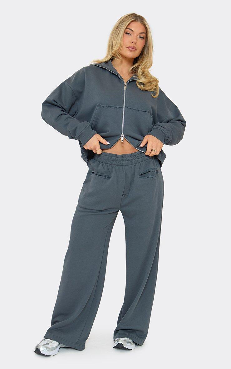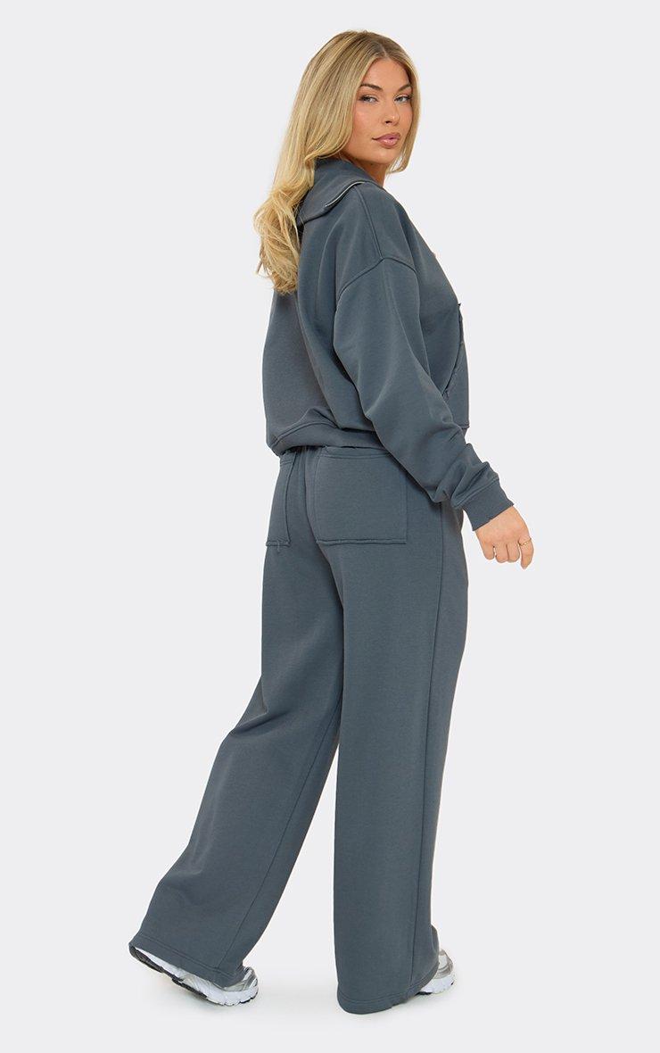 Mid Rise Contrast Piping Detail Wide Leg Joggers In Dark Navy Blue