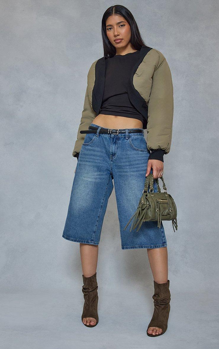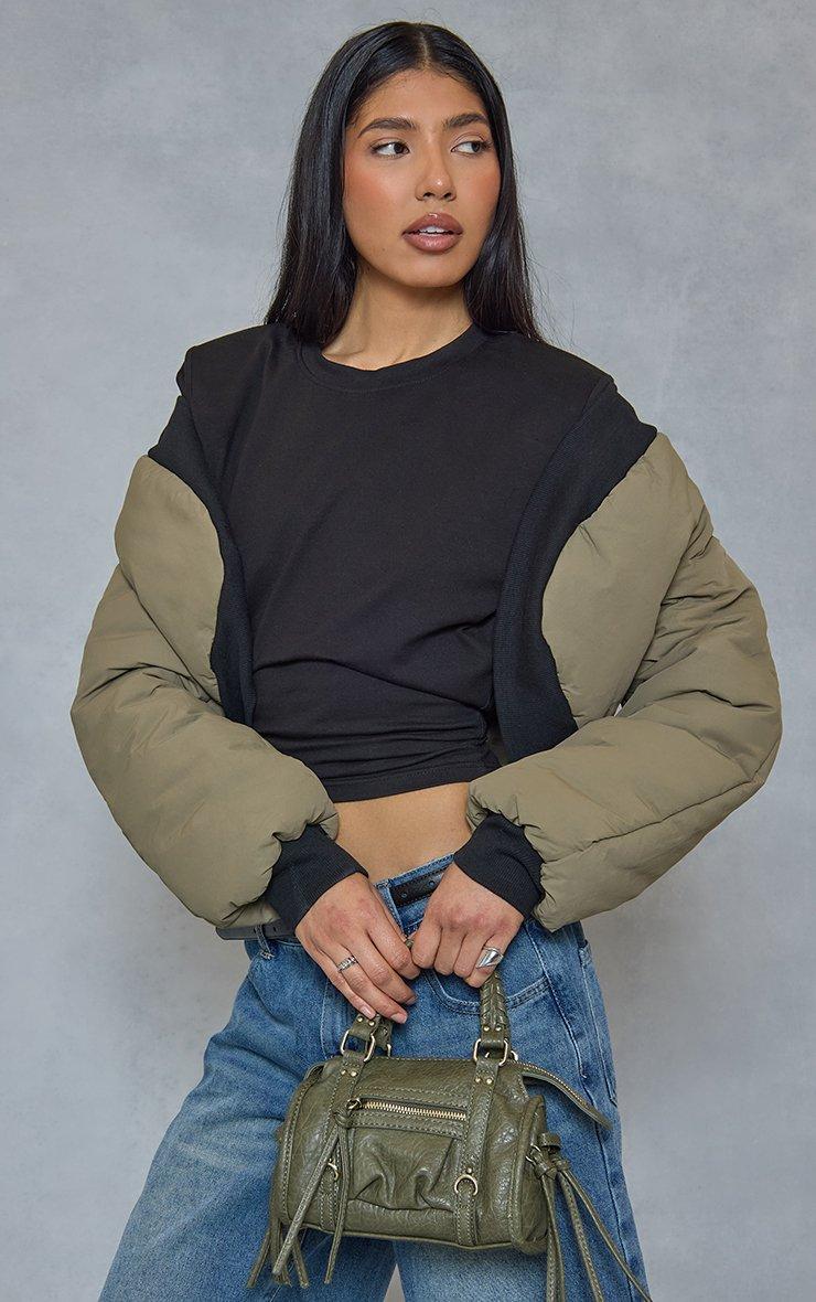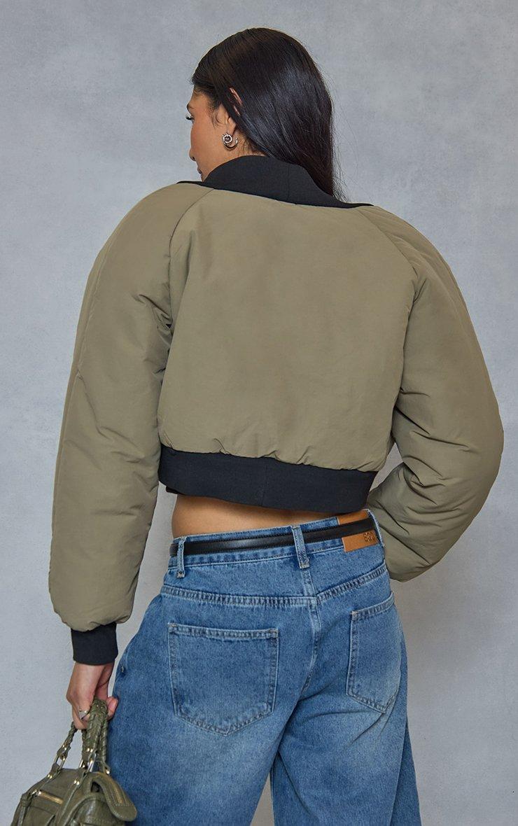 Cropped Rib Edge Detail Puffer Coat In Khaki Green