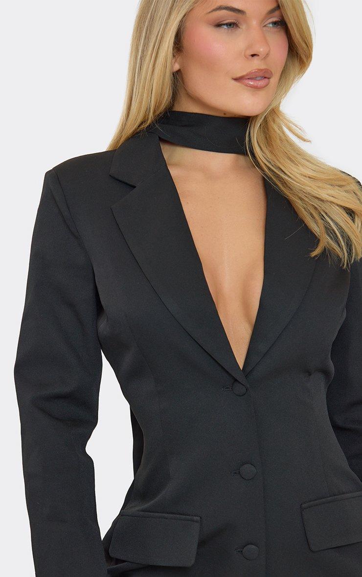 Shoulder Pad Scarf Detail Cinched Waist Blazer Dress In Black Woven