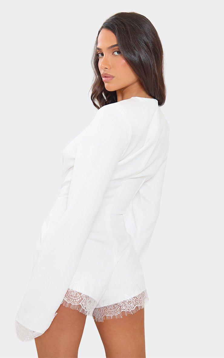 Long Sleeve Plunge Lace Panel Detail Tailored Playsuit In White