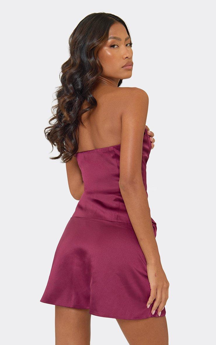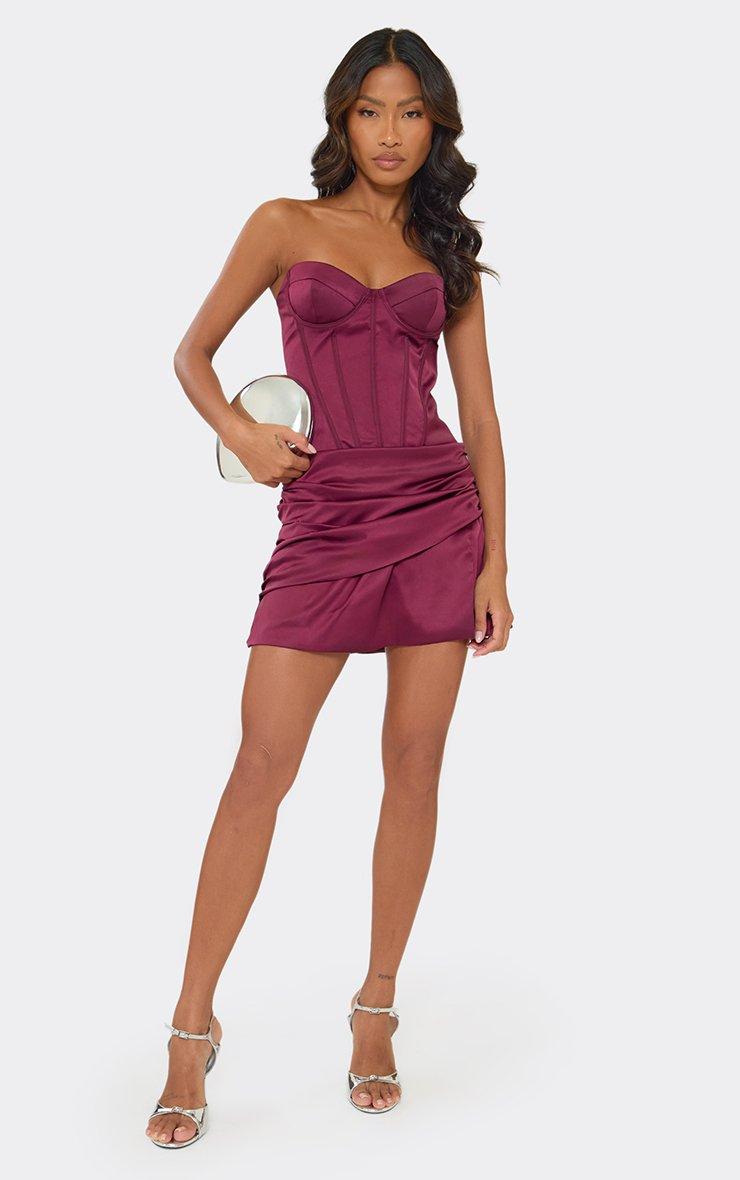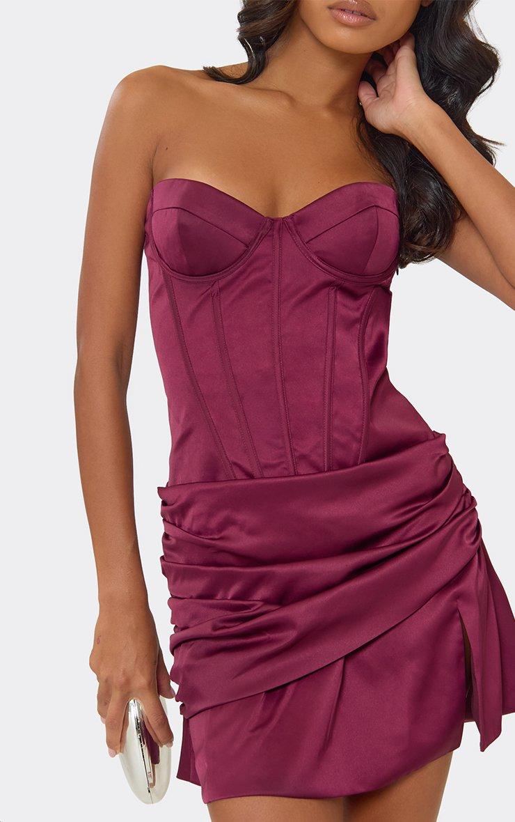 Bandeau Underwired Boning Detail Ruched Split Leg Mini Dress In Plum Satin
