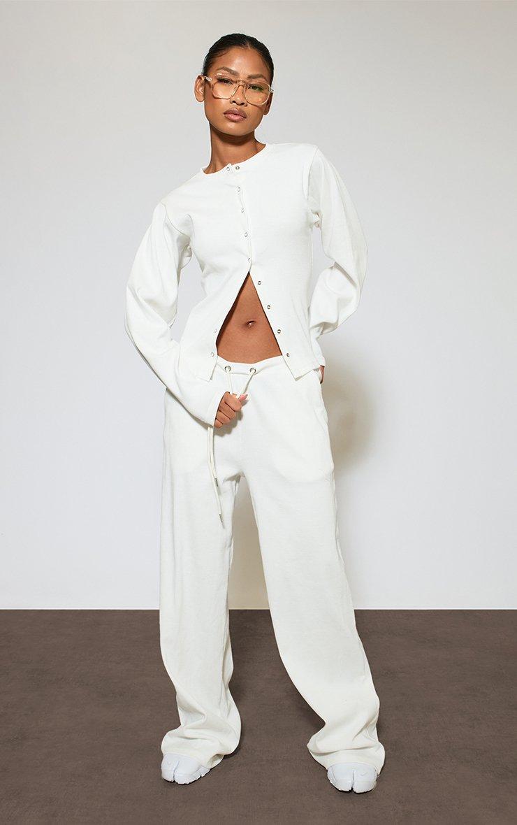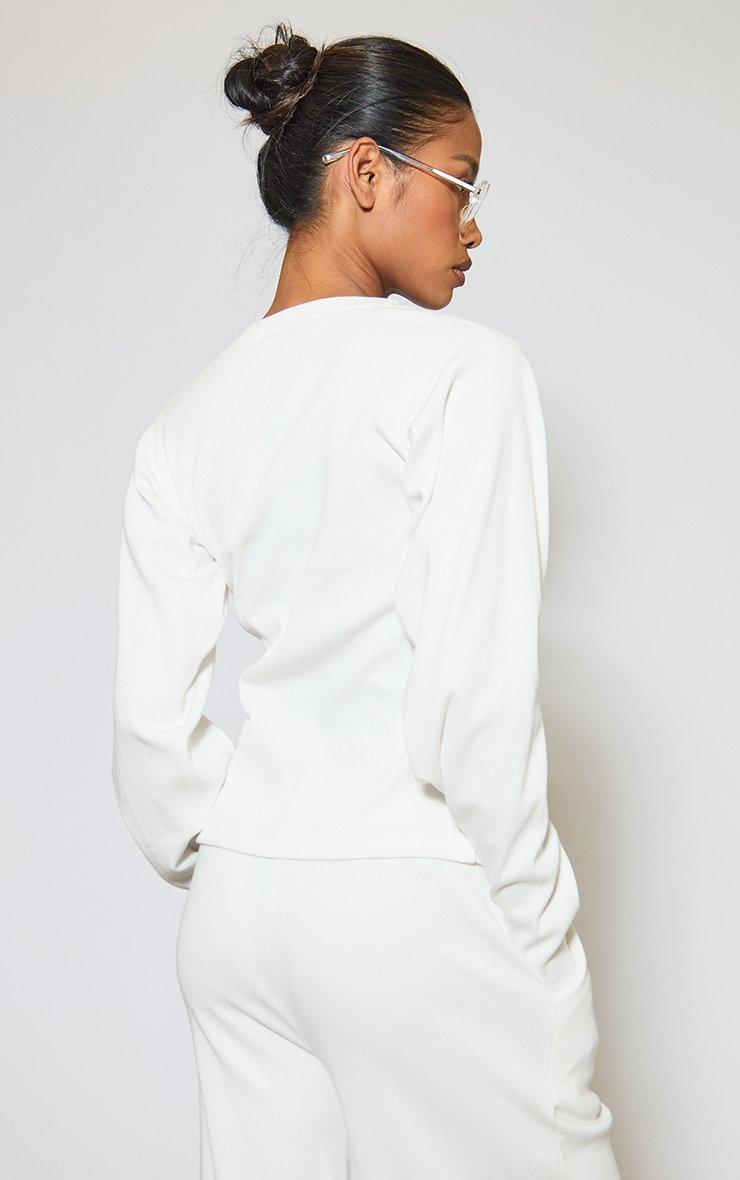 Long Sleeve Popper Detail Top In Cream Ribbed