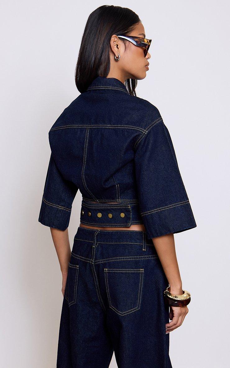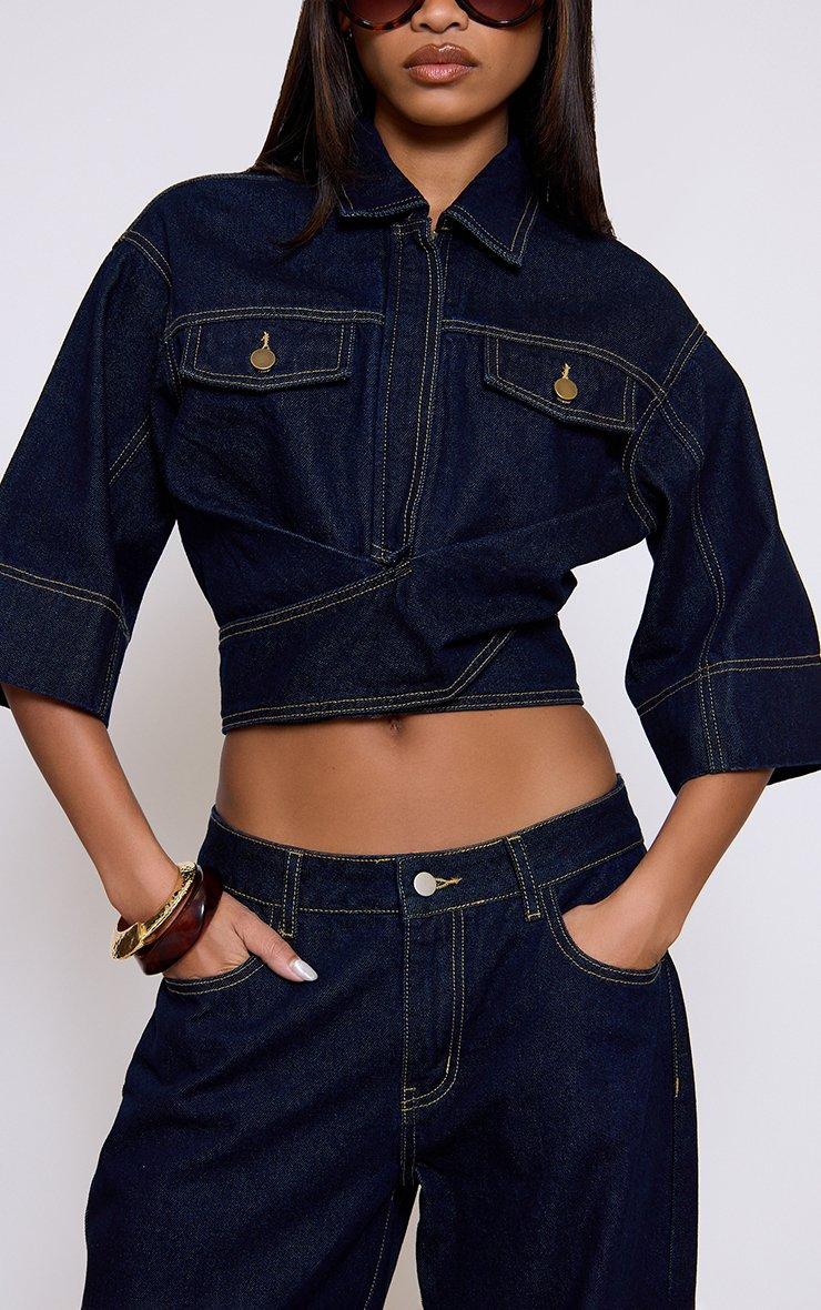 Short Sleeve Cinched Wrap Waist Top In Indigo Blue Denim