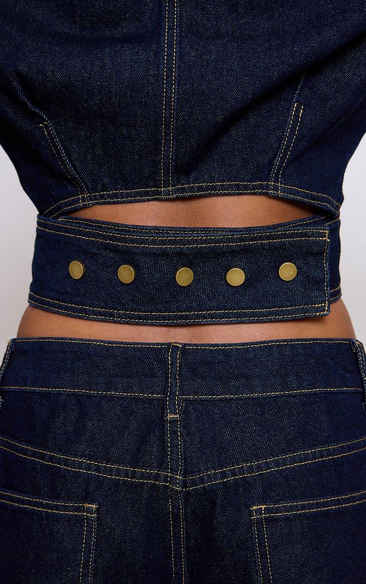 short sleeve cinched wrap waist top in indigo blue denim