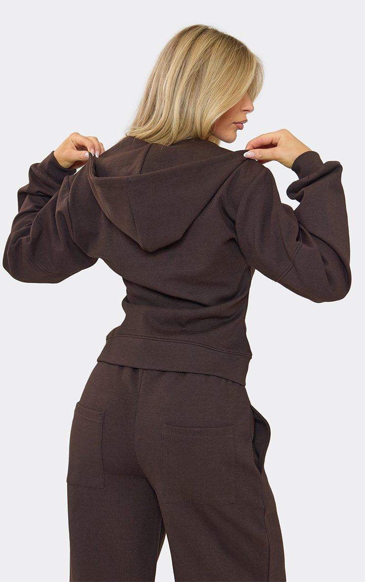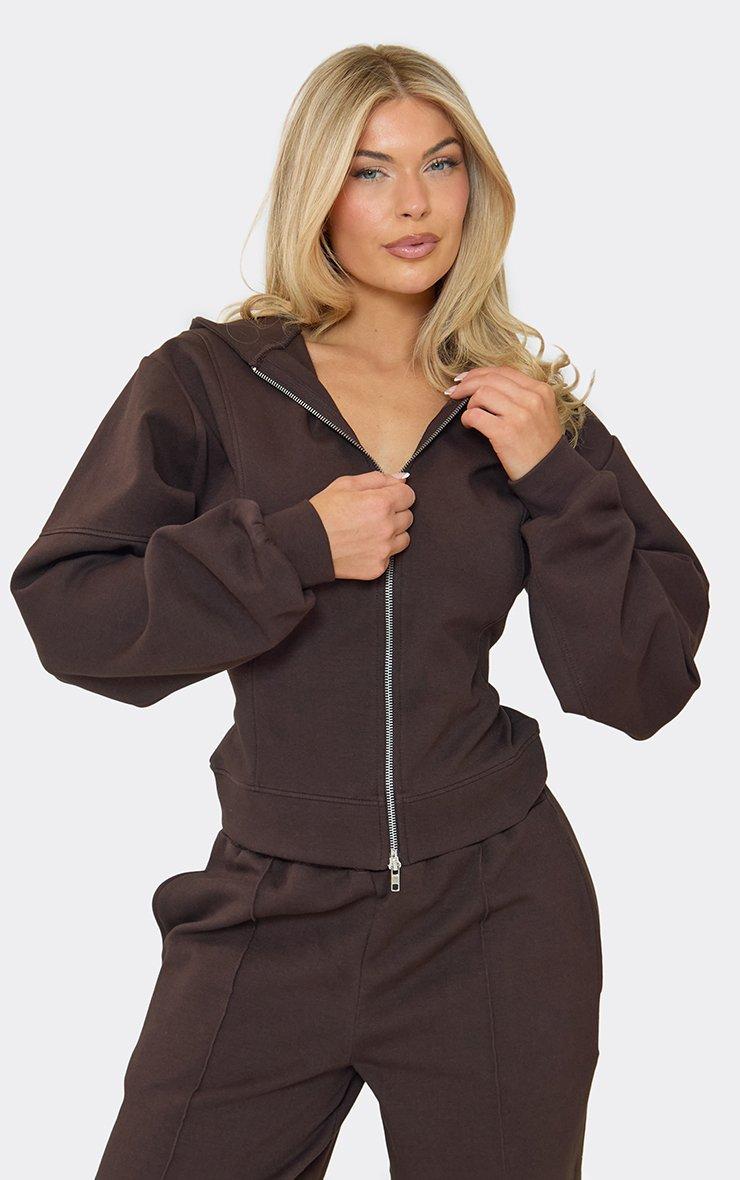 Double Zip-Up Cinched Waist Seam Detail Hoodie In Chocolate Brown Interlock