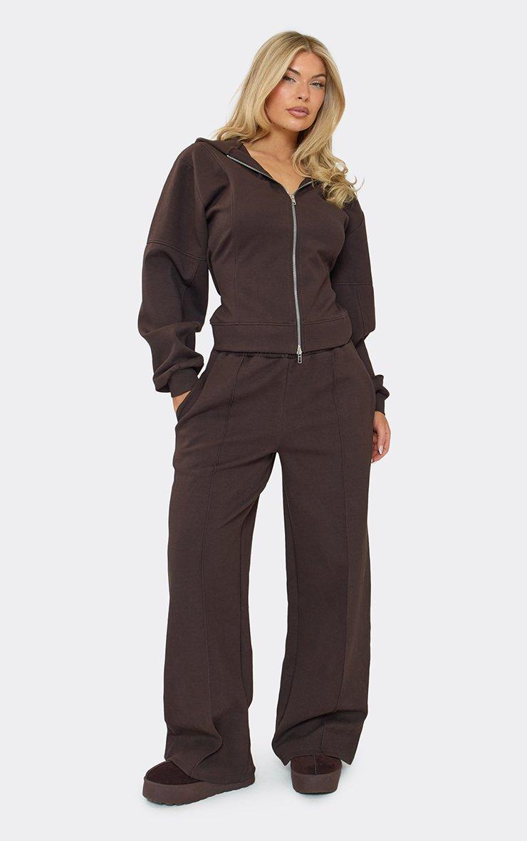 Mid Rise Seam Detail Straight Leg Joggers In Chocolate Brown Interlock