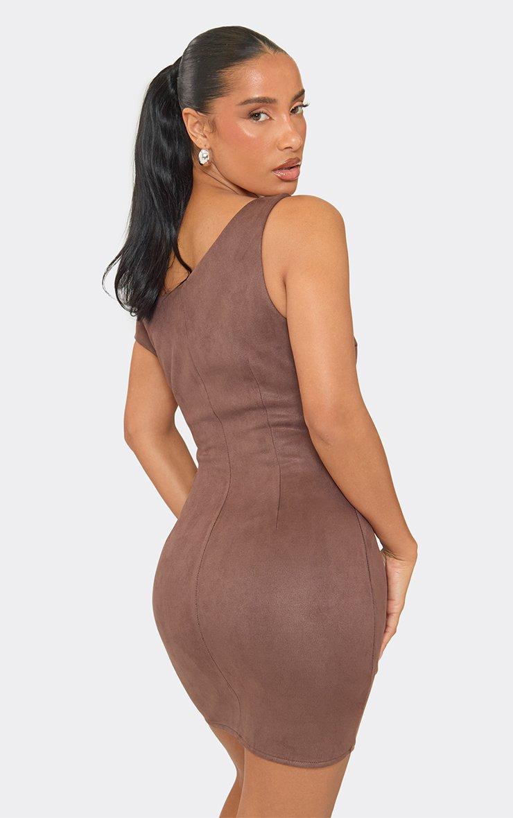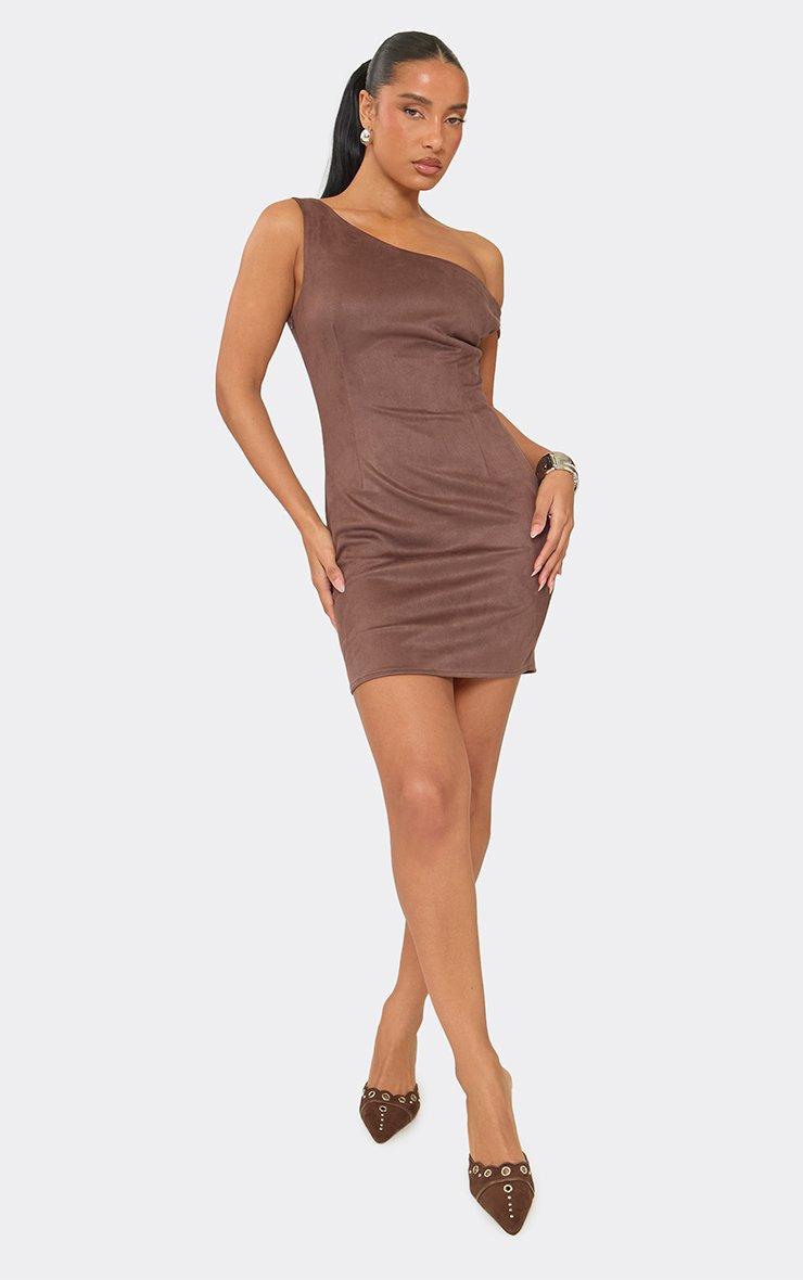 asymmetric off shoulder mini dress in chocolate brown faux suede