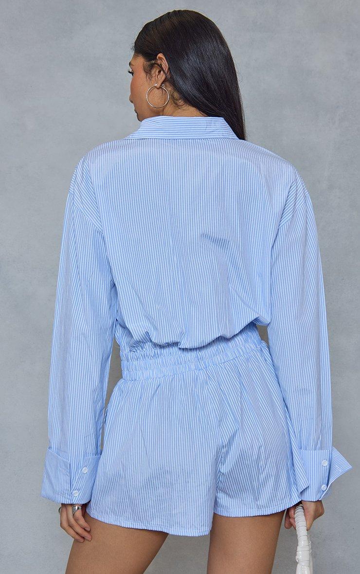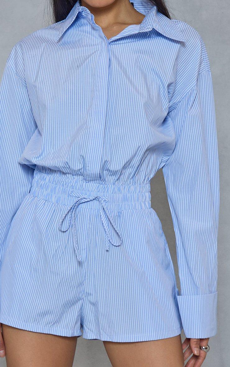 long sleeve tie waist detail playsuit in blue pinstripe