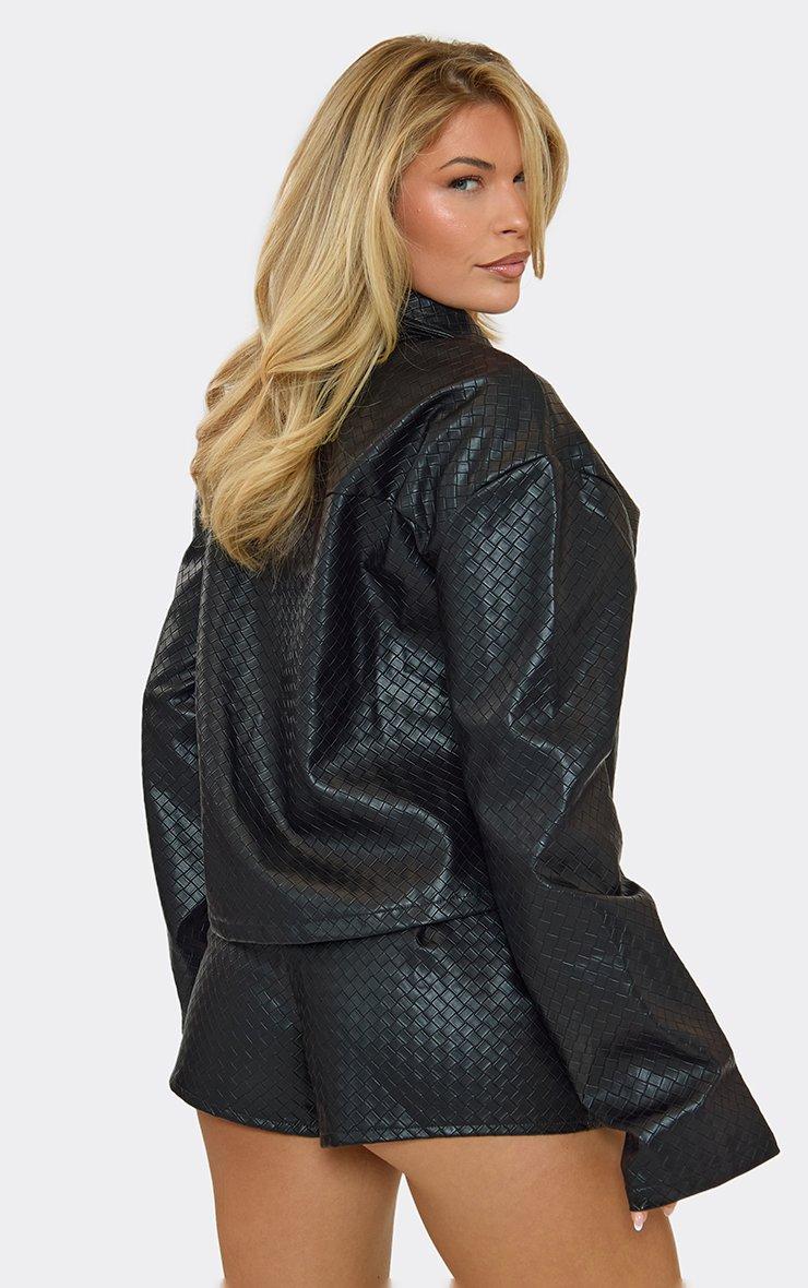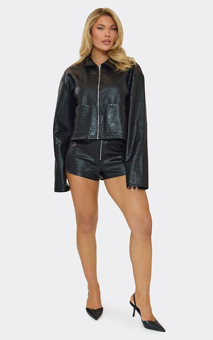 Mid Rise Zip Front Detail Shorts In Black Textured Faux Leather